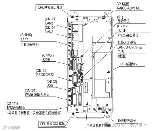 CPU单元(JZNC-ARK01-E)是由基板(JANCD-ABB01-E)、(JANCD-ABB02-E),机器人I/F基板(JANCD-AIF01-□E)、CPU基板(JANCD-ACPO1-E)构成。