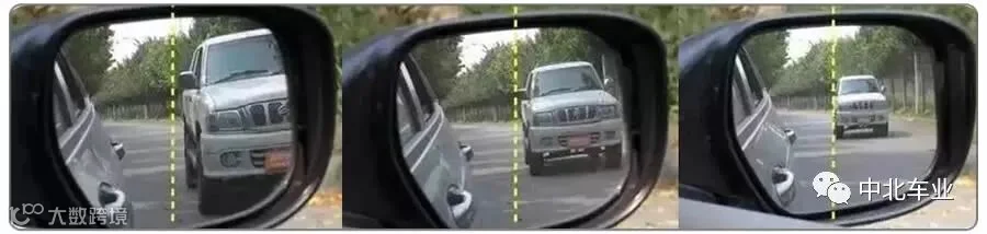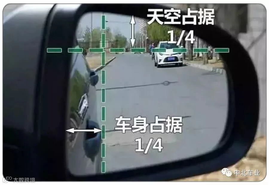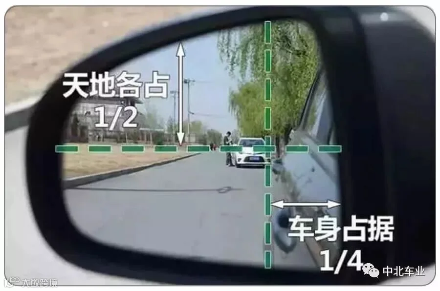 左侧外后视镜调节应为上下各占一半,也就是天地之间1:1的比例,左3/4右1/4(1/4面积靠近车身),能看到后车门的门把手。