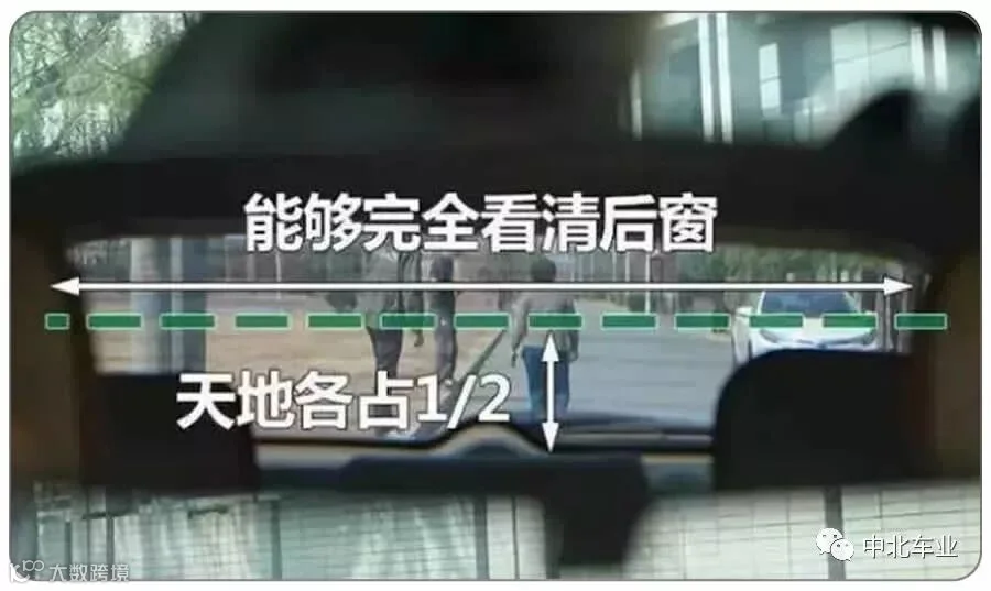 中央后视镜调节时应注意三点,第一,右侧耳朵在镜子左侧边缘处可见;第二,整个后风挡处于内后视镜内;第三,远处天地之间比例为1:1。
