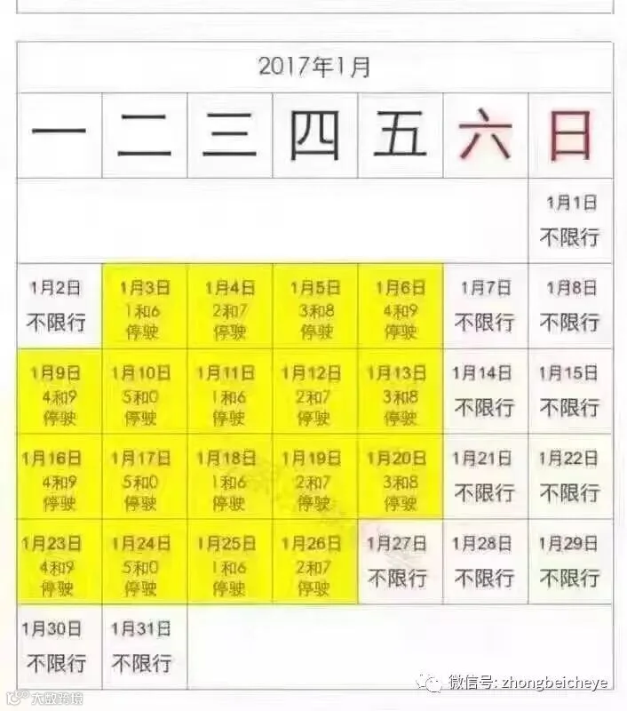1月1日至1月8日,工作日周一至周五分别限行0和5、1和6、2和7、3和8、4和9;