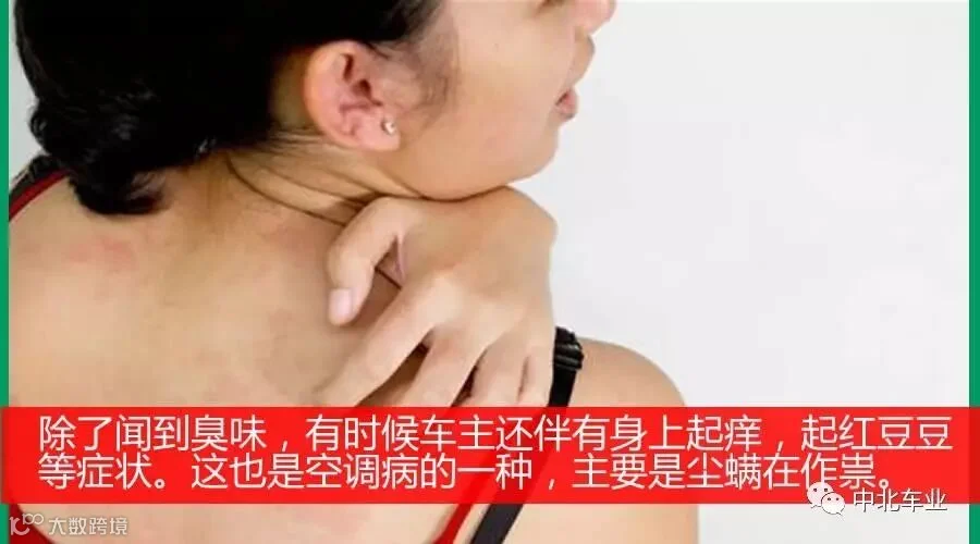 除了闻到臭味,有时候车主还伴有身上起痒,起红豆豆等症状。这也是空调病的一种,主要是尘螨在作祟。