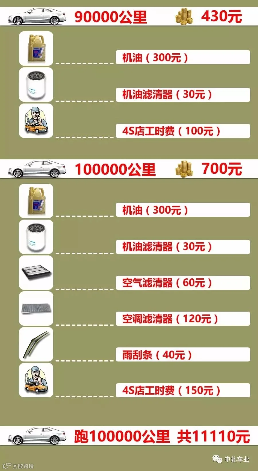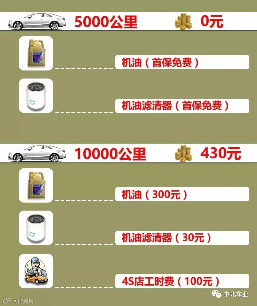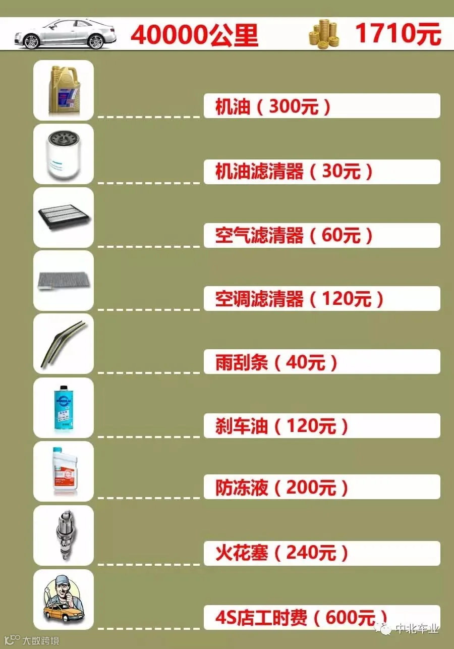 一辆10万左右的家轿,一般跑10万公里,到底要花费多少银子在保养上呢?话不多说,直接上图。