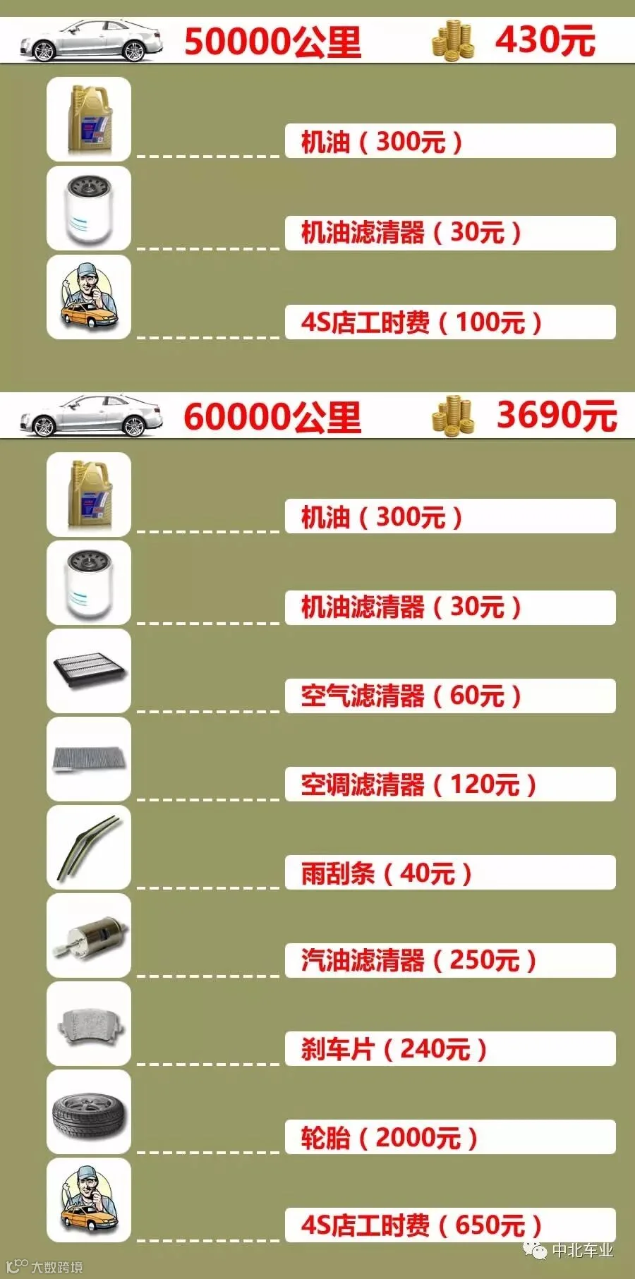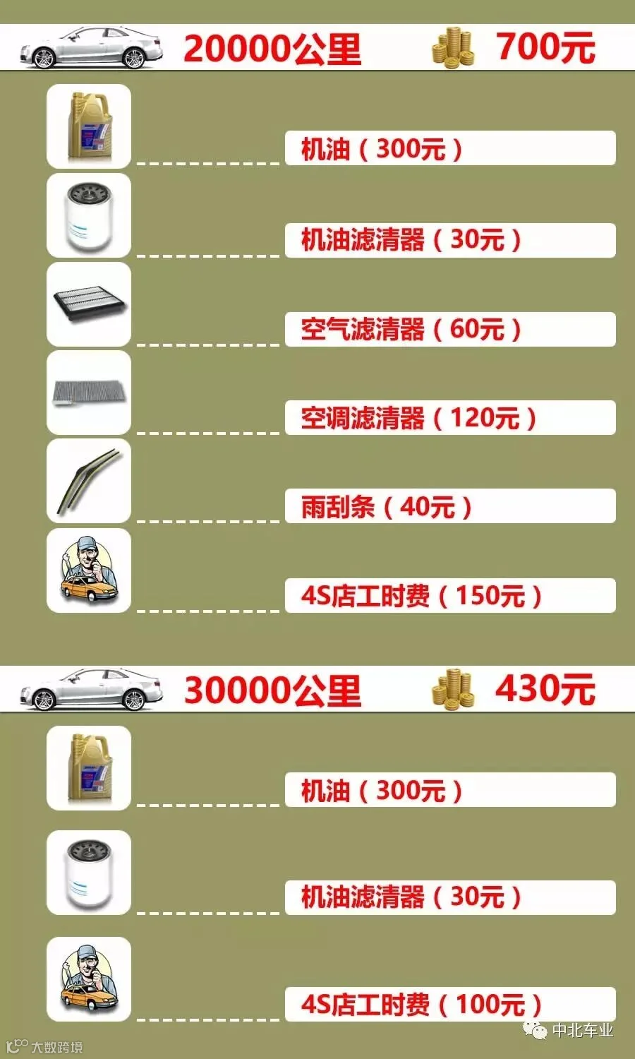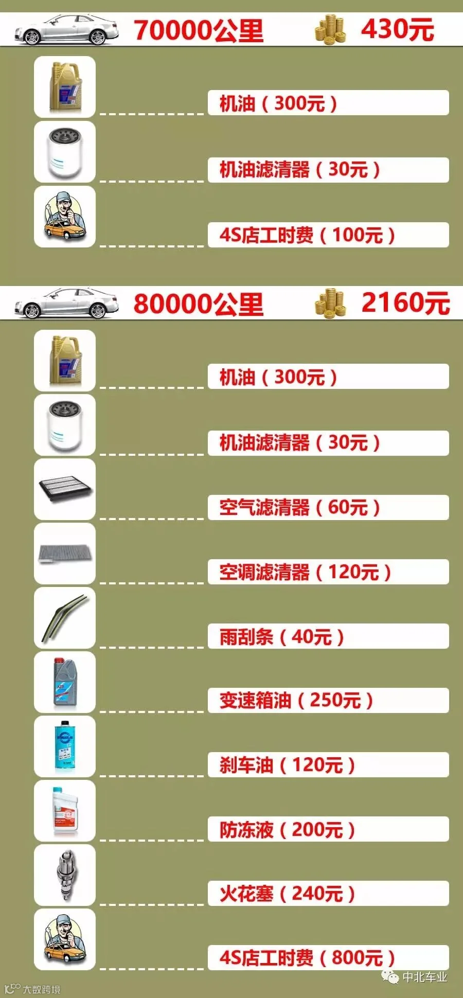 一辆10万左右的家轿,一般跑10万公里,到底要花费多少银子在保养上呢?话不多说,直接上图。