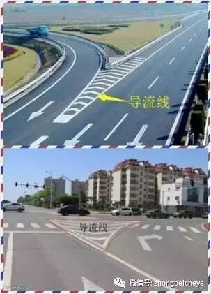 主要为一个或几个根据路口地形设置的白V形线或斜纹线区域,表示车辆必须按规定的路线行驶,不得压线或越线行驶。 主要用于过宽、不规则或行驶条件比较复杂的交叉路口,立体交叉的匝道口或其他特殊地点。图中这也是导流线,一定不是停车区或者安全区,如果被拍到停在这里,就会扣三分罚一百。