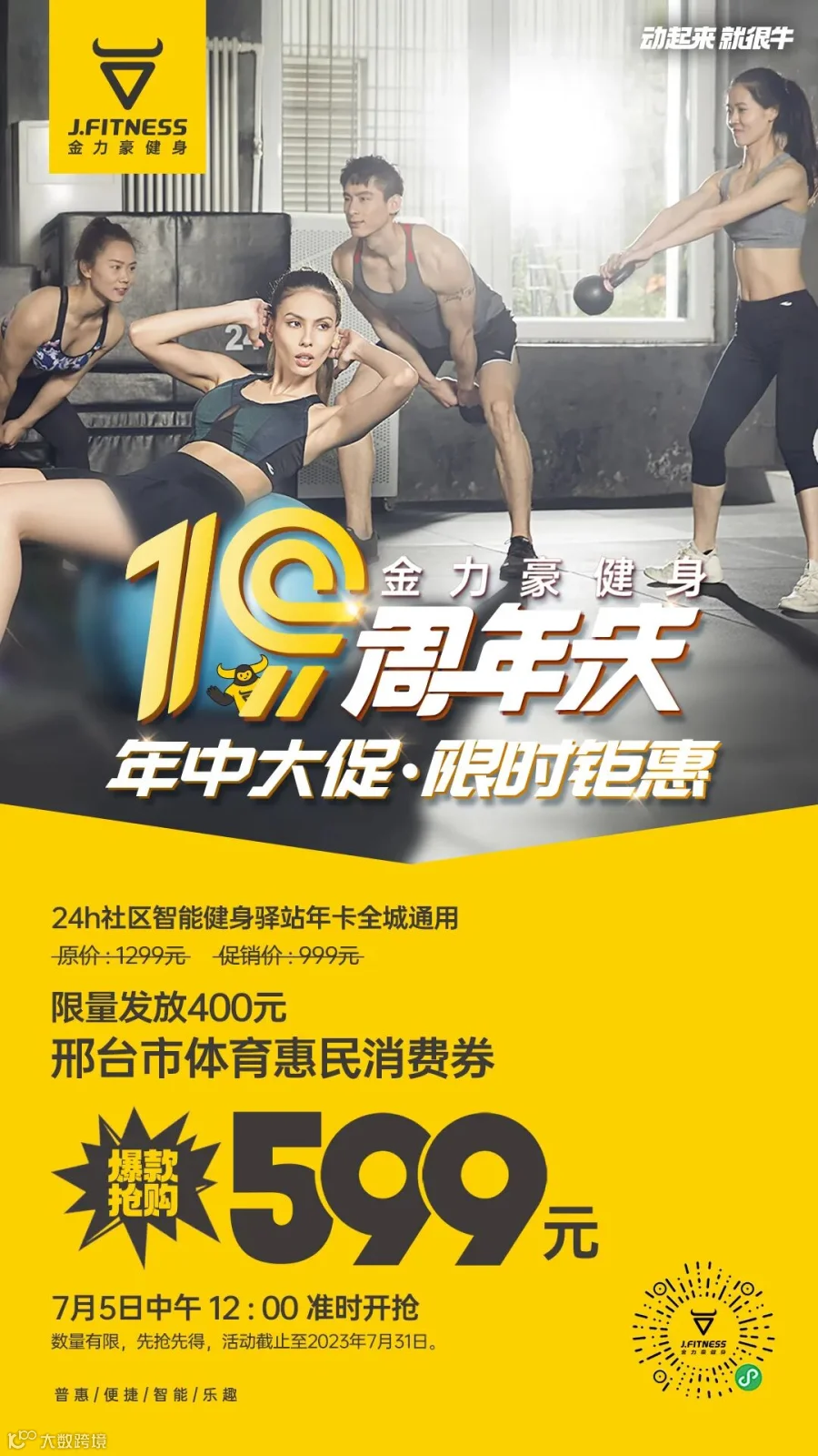 7月份是金力豪的19周年庆,为感谢小伙伴们的支持与厚爱,限量发放“400元邢台市体育惠民消费券”,24h社区智能健身驿站年卡,领券抢购仅需599元,点击下方图片领券即可购买,大家不要错过福利哦!!!