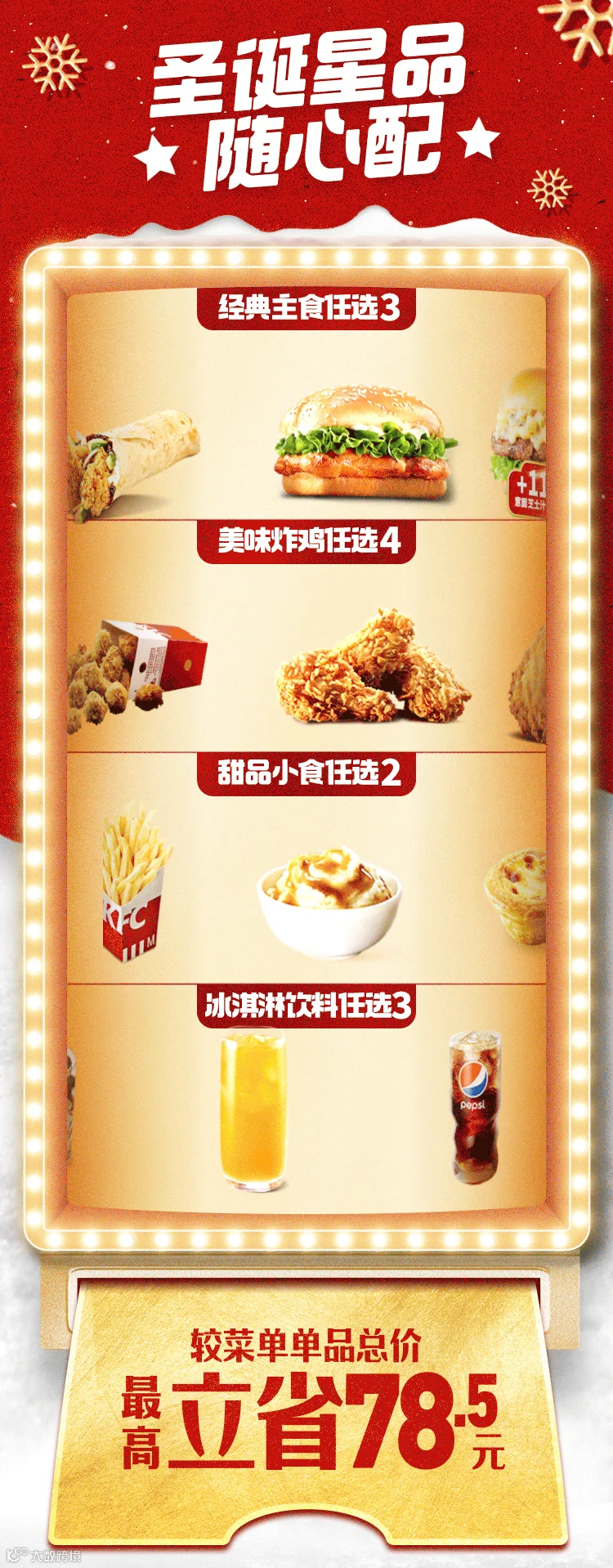 圣诞畅选桶自2022年12月16日-2022年12月25日上市,仅限9:30-23:00供应,上海市、广东省、福建省、海南省、广西壮族自治区等部分地区仅限10:30-23:00供应,具体以餐厅实际营业时间为准。活动期间,到店或自助点餐到店自取购买圣诞畅选桶,可在指定主食中任选3件单品、在指定炸鸡中任选4件单品、在指定小食甜点中任选2件单品、在指定饮料和冰淇淋中任选3件单品,指定产品详情以菜单显示为准。热辣芝芝肉酥脆皮鸡2.0自2022年11月25日起上市,全国售卖数量为1529万块,售完即止。如遇桶内的热辣芝芝肉酥脆皮鸡2.0售罄,则热辣芝芝肉酥脆皮鸡2.0 1块将替换为黄金脆皮鸡1块。仅限有此产品供应的肯德基餐厅,交通枢纽、旅游景区的餐厅及精选餐厅等部分餐厅不供应此产品,具体情况以餐厅餐牌公示为准。不适用于肯德基宅急送。产品及包装以实物为准。圣诞畅选桶中的指定主食可补11元替换为意面芝士汁汁厚牛堡1个。意面芝士汁汁厚牛堡自2022年11月25日起上市,全国售卖数量共为261万个,售完即止。