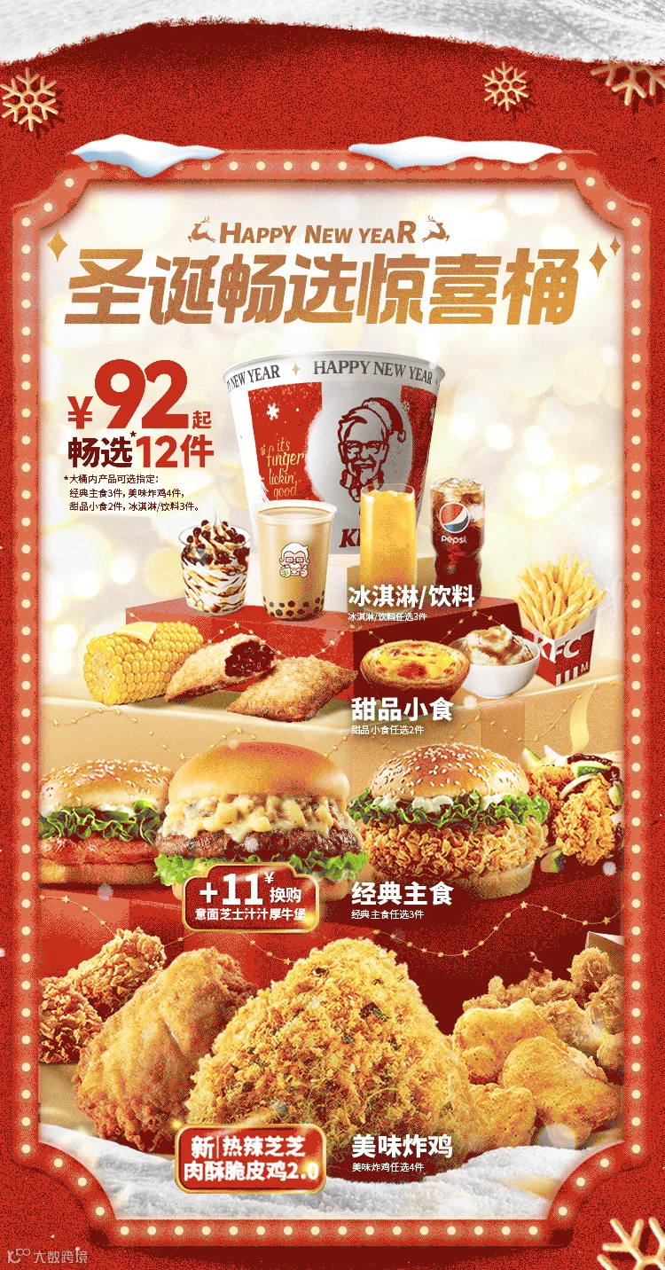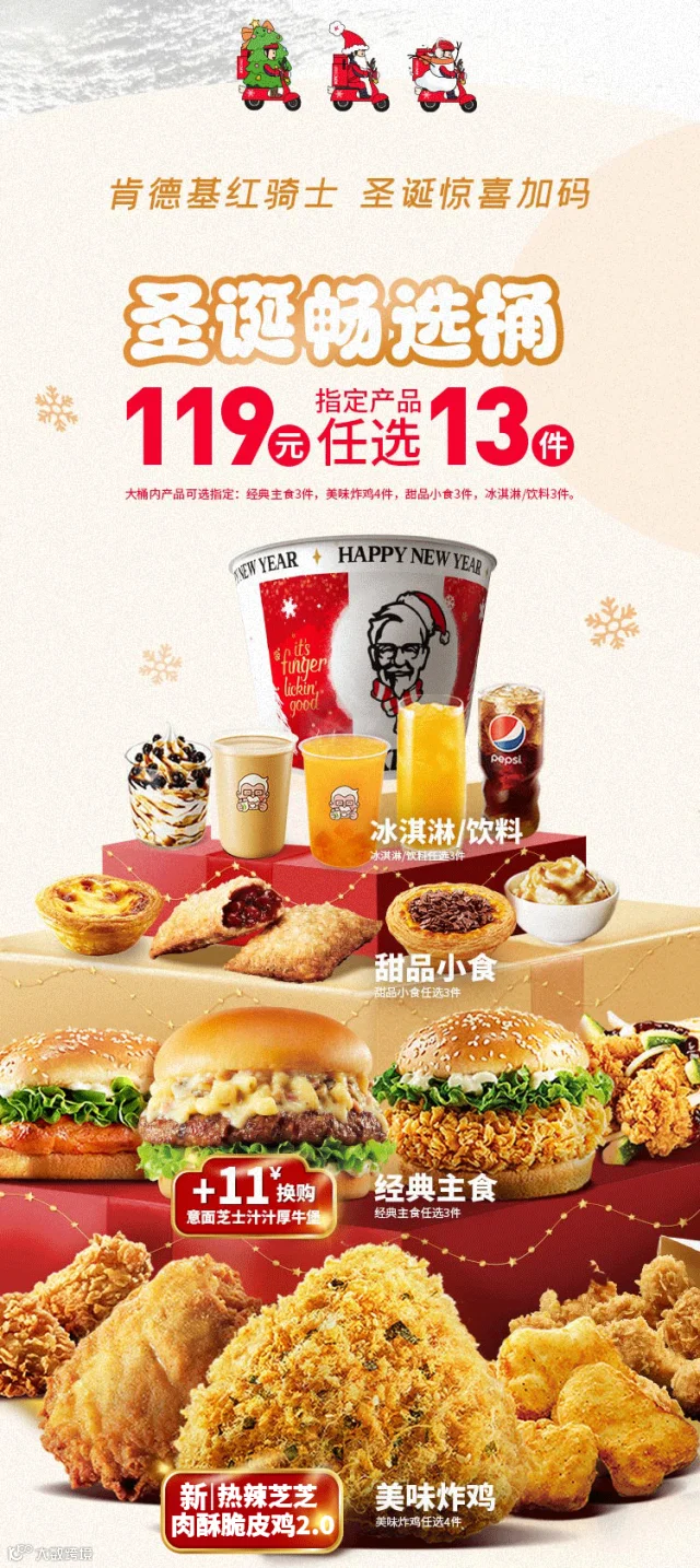 圣诞畅选桶自2022年12月16日-2022年12月25日上市,仅限9:15-22:44,上海市、广东省、福建省、海南省、广西壮族自治区等部分地区仅限10:15-22:44,具体以该送餐区域实际服务时间为准。活动期间,在肯德基宅急送点餐,可在指定主食中任选3件单品、在指定炸鸡中任选4件单品、在指定小食甜点中任选3件单品、在指定饮料和冰淇淋中任选3件单品,指定产品详情以菜单显示为准。热辣芝芝肉酥脆皮鸡2.0自2022年11月25日起上市,全国售卖数量为1529万块,售完即止。如遇桶内的热辣芝芝肉酥脆皮鸡2.0售罄,则热辣芝芝肉酥脆皮鸡2.0 1块将替换为黄金脆皮鸡1块。麦片脆脆生巧风味蛋挞自2022年11月25日起在全国上市,全国限量300万个,售完即止。橘橙柚爆有汁果茶自2022年11月28日起上市,共限量160万杯,售完即止。仅限肯德基宅急送送餐范围及服务时间,部分送餐区域不供应此产品,不同送餐区域的服务时间有差异,详情以输入送餐地址后显示的菜单及送餐时间为准。不与其他优惠共享。产品及包装以实物为准。圣诞畅选桶中的指定主食可补11元替换为意面芝士汁汁厚牛堡1个。意面芝士汁汁厚牛堡自2022年11月25日起上市,全国售卖数量共为261万个,售完即止。