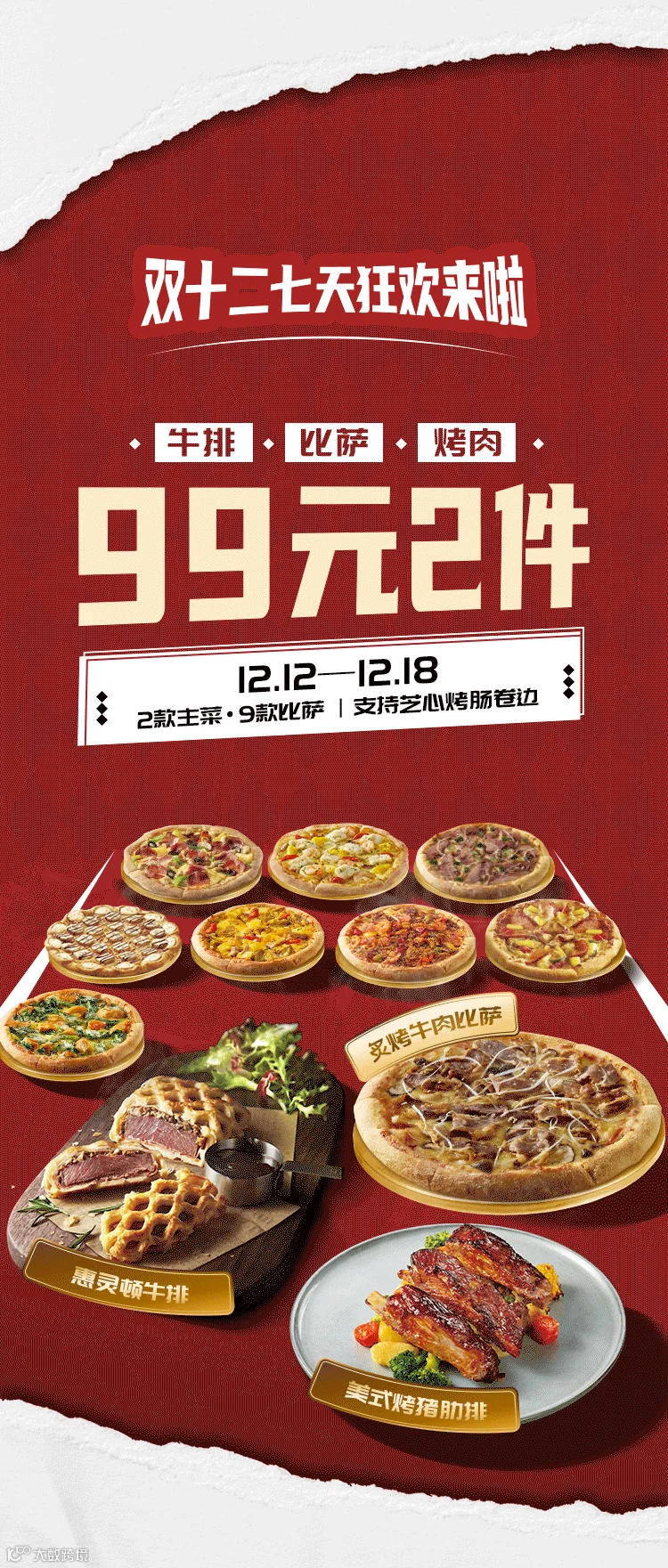 本活动自2022年12月12日至2022年12月18日(早餐时段7:30-10:30除外)。活动期间,可以99元在指定产品中任意选购2份。可选指定产品含:美式烤猪肋排、惠灵顿牛排(限堂食/自助点餐扫码点餐+预点餐渠道选购),以及指定口味的手拍/铁盘/芝心卷边/双芝卷边/烤肠卷边/酥松卷边普通装比萨(老北京风味烤鸭比萨、主厨葡式咖喱菲力牛肉比萨、黄金六两松板肉比萨、海鲜至尊比萨(鳕鱼版)、炙烤牛肉比萨、必胜元气鸡肉比萨、超级至尊比萨、麻辣超级至尊比萨),香蕉可可比萨(芝心卷边/烤肠卷边普通装)。
