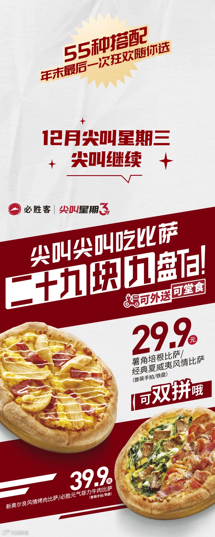 “尖叫星期三”本轮活动期间(限2022年12月7日,12月14日,12月21日,12月28日,周三),在指定必胜客欢乐餐厅可以如下单品价点购对应的指定产品(仅限堂食、自助点餐外带自取和必胜客宅急送渠道):①: 以29.9元购买薯角培根经典夏威夷风情双拼比萨1份;或薯角培根比萨或经典夏威夷风情比萨1份,限手拍普装/铁盘普装。②: 以39.9元价格购买新奥尔良风情烤肉必胜元气菲力牛肉双拼比萨1份;或新奥尔良风情烤肉比萨或必胜元气菲力牛肉比萨1份,限手拍普装/铁盘普装。“可双拼”指活动期间,同饼底同大小的①薯角培根口味和经典夏威夷风情口味可组合;②新奥尔良风情烤肉口味和必胜元气菲力牛肉口味可组合(限手拍普装/铁盘普装)。产品及包装以实物为准,具体产品及价格以餐厅菜单为准,图示内容仅供参考。本活动有关优惠权益不与任何未标明“可与其他优惠共享”的权益共享。本活动不适用于机场、火车站、高速公路、旅游度假、游乐场、展览馆、ToGo、Bistro、Express、LesElites、奥特莱斯、佛罗伦萨、精选餐厅以及必胜客部分特定餐厅,详洽餐厅。广告内容仅供参考,产品及包装请以实物为准,具体产品及价格以点餐渠道中的菜单内容为准。如有疑问,请咨询必胜客在线客服,在线客服工作时间(9:00-22:00)。