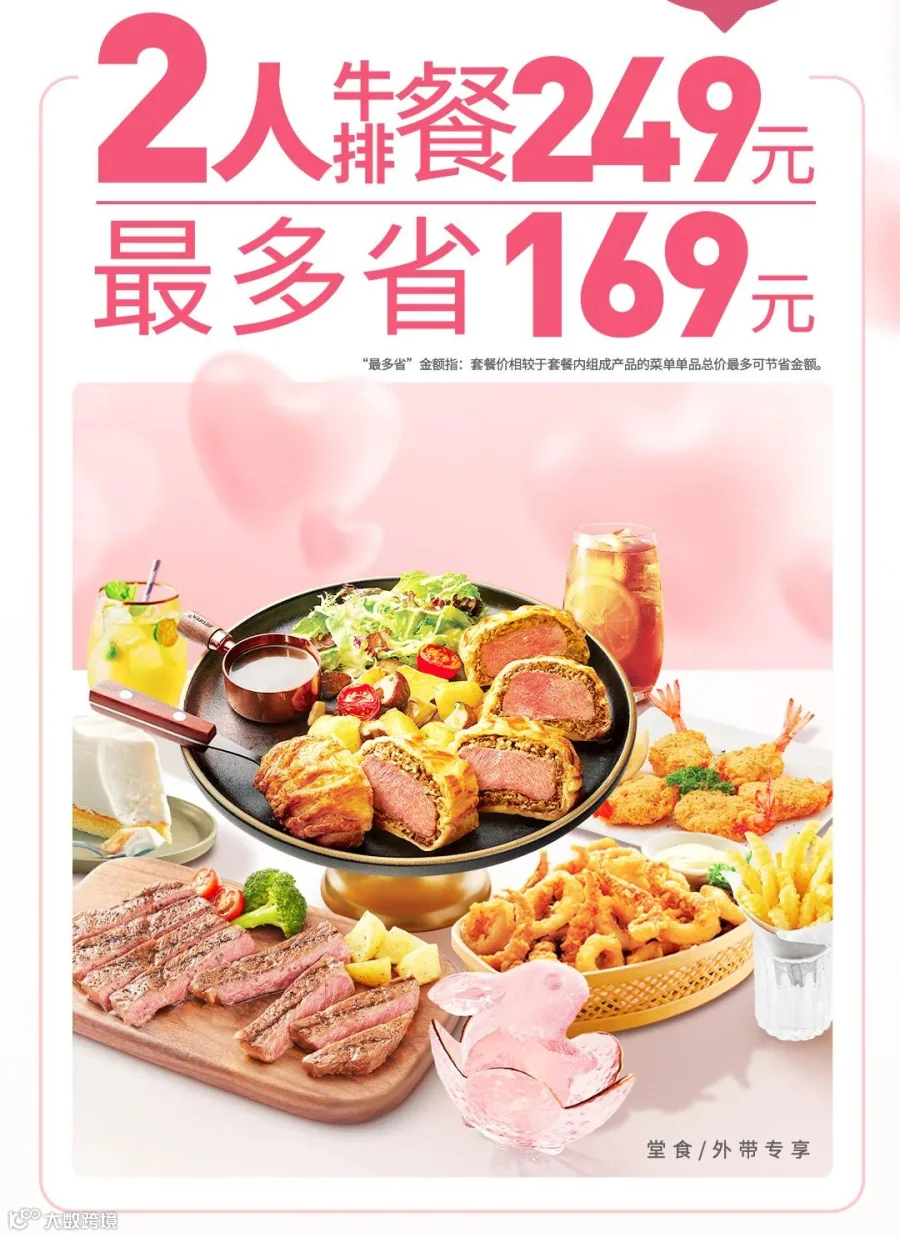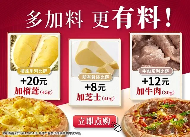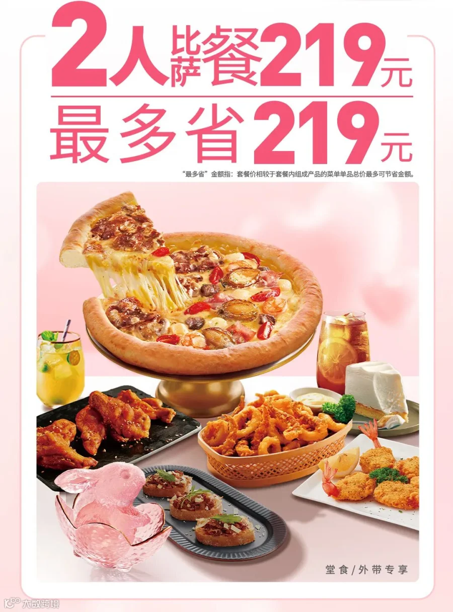 本活动自2023年2月10日至2月14日。限堂食/自助点餐-扫码点餐/自助点餐-预点餐/自助点餐-外带自取,本活动优惠权益不与其他任何优惠共享。“单品价”产品不含菜单中的“特/惠/券”产品、套餐产品及必胜优选系列产品。图示内容仅供参考,产品及包装请以实物为准。本活动不适用于机场、火车站、高速公路、旅游度假、游乐场、展览馆、ToGo 、Express、Les Elites、奥特莱斯、精选餐厅以及部分特定必胜客餐厅,请详洽餐厅。必胜客宅急送不同送餐区域的菜单和价格有所不同,不同时段产品品项及价格有所不同,详情以输入送餐地址后显示的实际供应的菜单为准。