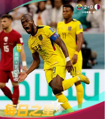 每日之星 恩纳-瓦伦西亚当选世界杯首日最佳球员世界杯揭幕战,厄瓜多尔2-0战胜卡塔尔的比赛中,恩纳-瓦伦西亚仅用30分钟梅开二度帮助球队收获首胜。