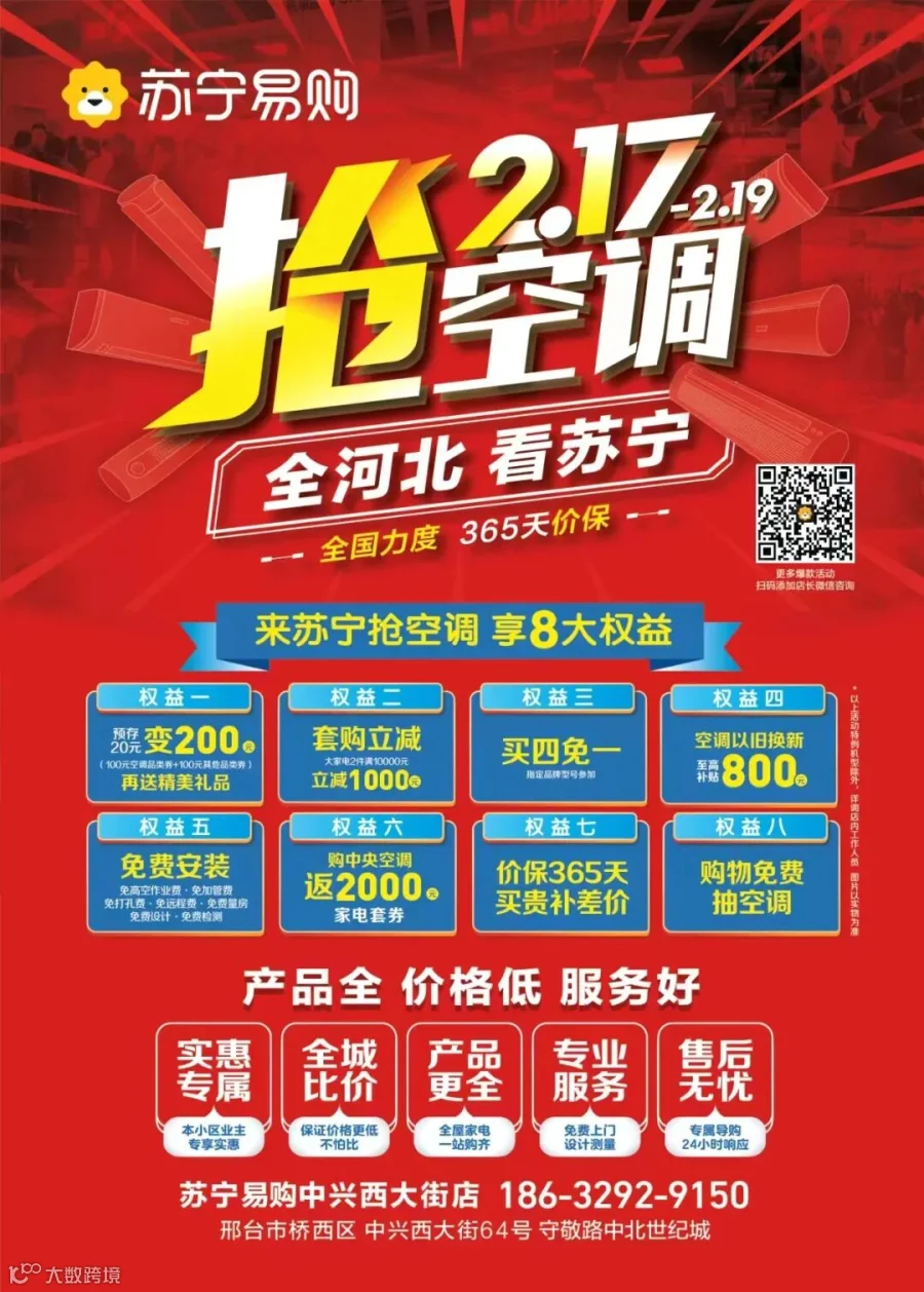 导读:期待一年之久的开年抢空调来啦!2.17-2.19抢空调,全河北看苏宁活动门店:邢台桥西中北世纪城苏宁易购!