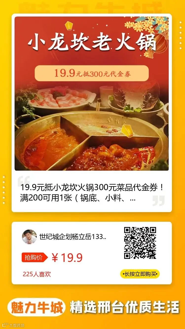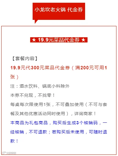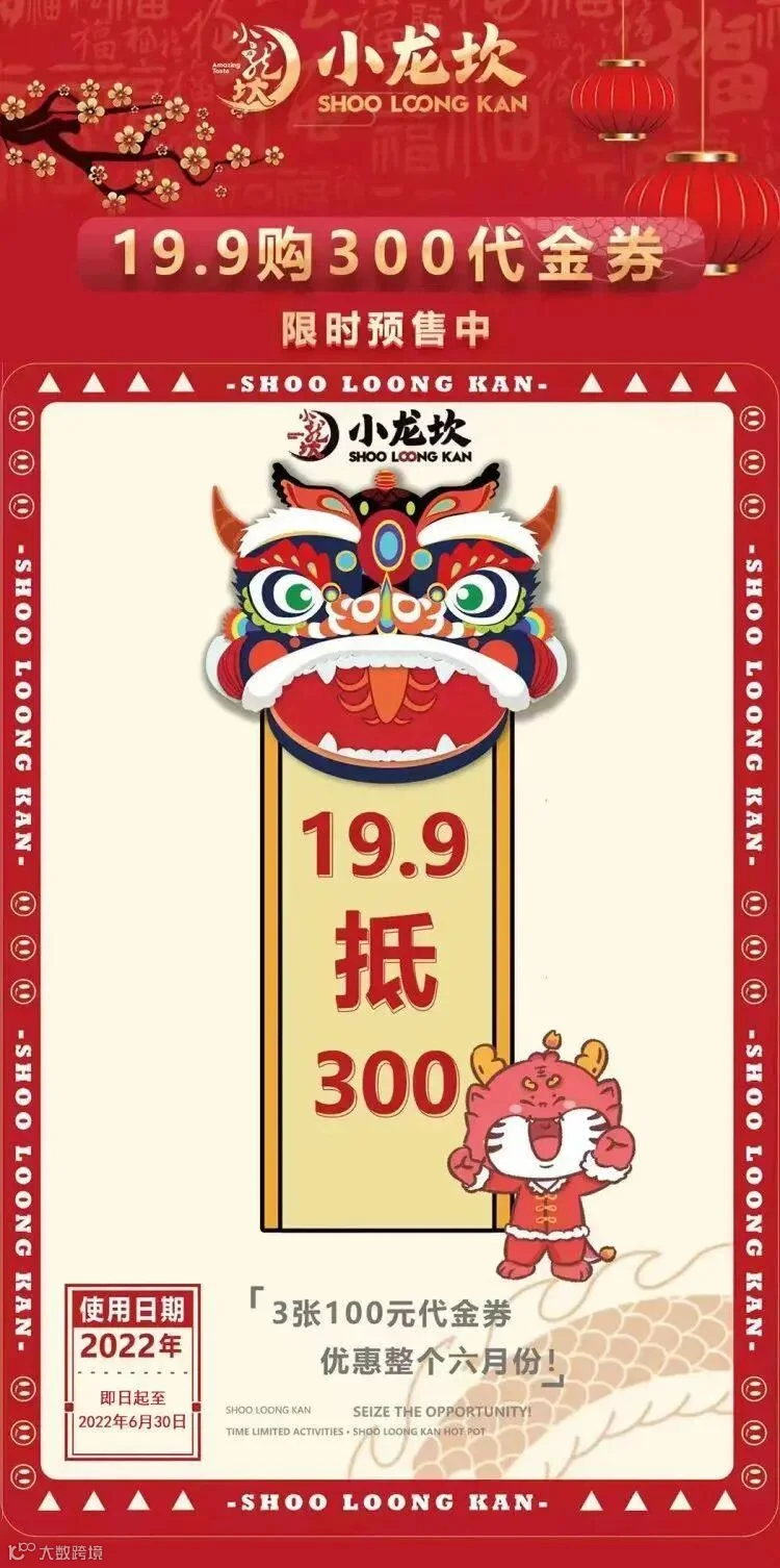 19.9元抵小龙坎火锅300元菜品代金券!满200可用1张(锅底、小料、酒水除外)!周末节假日通用