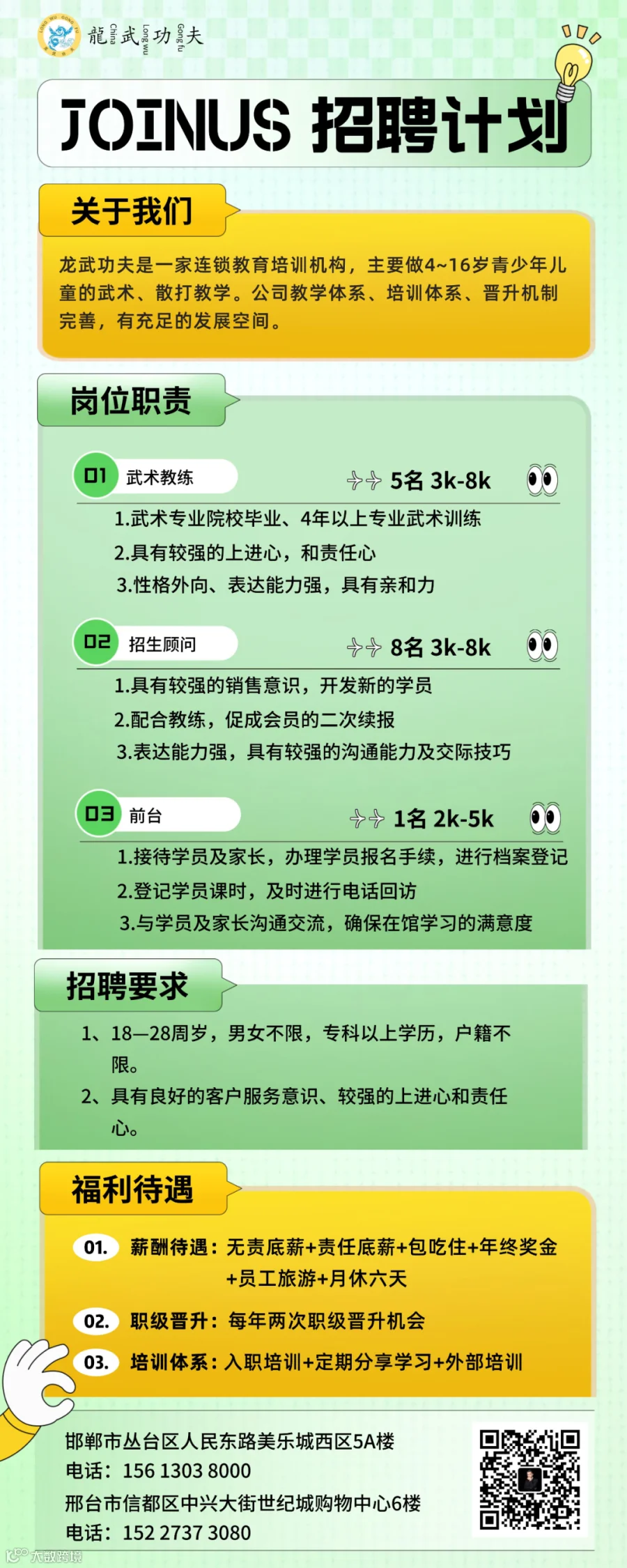 主要做4~16岁青少年儿童的武术、散打教学。公司的教学体系、培训体系、晋升机制完善,所有分店皆为直营,只要你有很好的学习力,就有充足的发展空间。