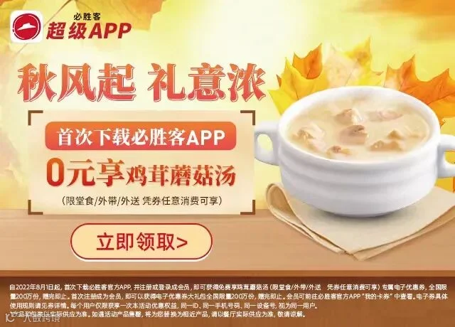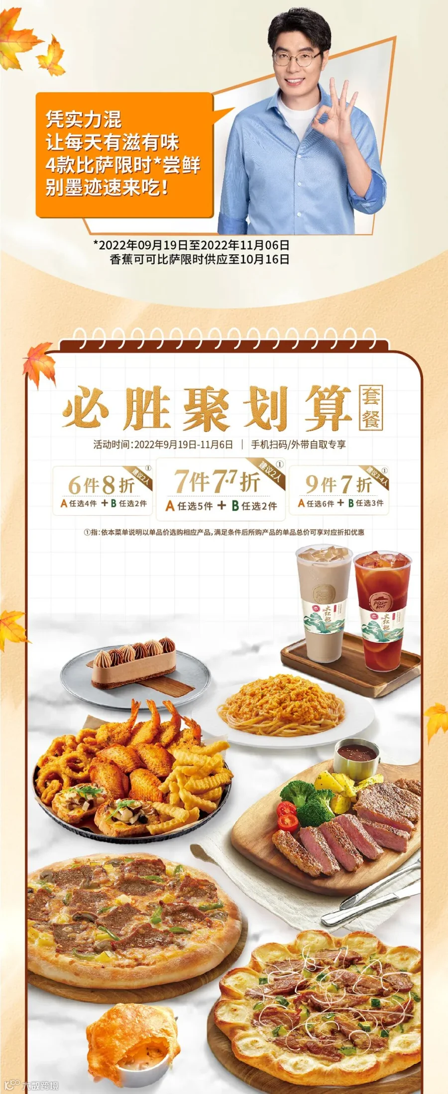 即日起至2022年11月6日期间,通过堂食扫码点餐、自助点餐外带自取选购“必胜聚划算”套餐,依照页面说明以单品价选购其中不同分类产品且所选单品满足相应数量,则已选购的必胜聚划算套餐中的全部单品的单品总价可享相应折扣优惠。“不同分类产品”的相应单品数量及对应折扣请以活动点餐渠道中的菜单内容及相关说明为准。所购产品的各类额外加料部分消费金额均不参与任何优惠活动。本优惠活动权益不与其他各类优惠共享。本活动不适用于机场、火车站、旅游度假、游乐场、展览馆、奥特莱斯以及部分特定必胜客餐厅等。自助点餐外带自取的活动产品有所不同,请以实际供应为准。必胜客宅急送活动内容及产品有所不同,请以必胜客宅急送官方网络订餐平台实际供应为准;不适用于第三方外送平台。