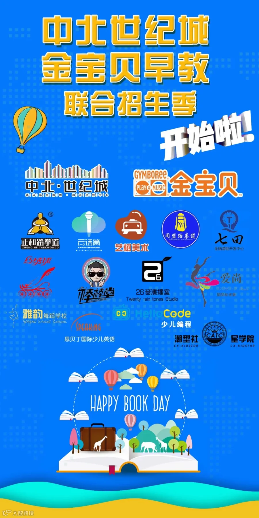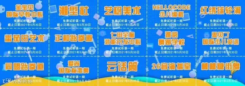 金宝贝国际早教中心+潮型社星学院+艺树小央美儿童美术+hellocode青少儿编程教育+红绣球轮滑+正和跆拳道+七田全脑潜能开发+雅韵舞蹈+思贝丁国际少儿英语+同盟跆拳道+爱尚国际标准舞+云话筒青少年艺术口才+26音演播室+棒棒堂街舞