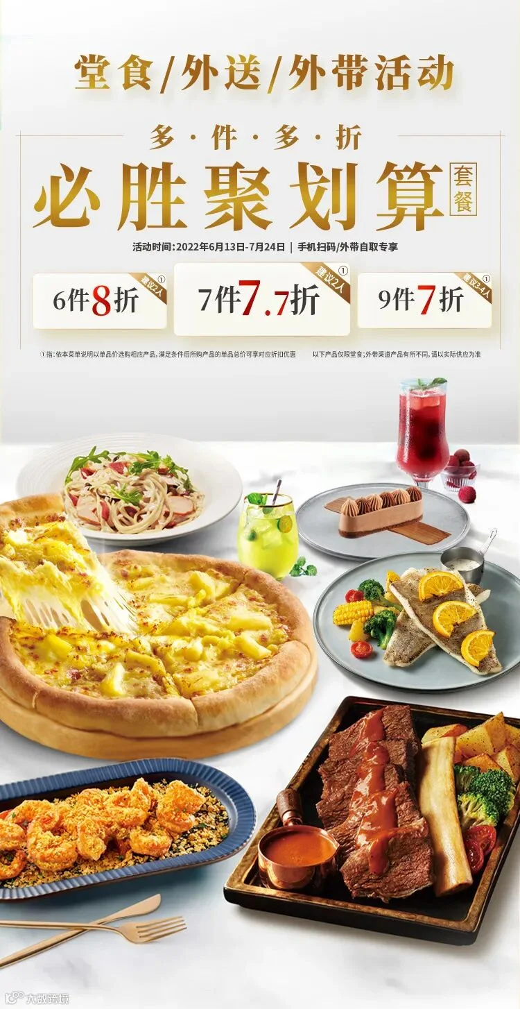 自2022年6月13日至2022年7月24日期间,通过堂食扫码点餐、自助点餐外带自取渠道选购“必胜聚划算”套餐,依照页面说明以单品价选购指定产品,满足对应的单品数量及相关条件后,所购产品的单品总价可享对应折扣优惠,具体产品以本活动指定餐厅相应菜单内容为准。餐厅菜单中的各类额外加料部分消费金额均不参与任何优惠活动。本优惠活动权益不与其他各类优惠共享。本活动不适用于机场、火车站、高速公路、旅游度假、游乐场、展览馆、Bistro 、Express、Les Elites、奥特莱斯、精选餐厅以及必胜客部分特定餐厅,详洽餐厅。