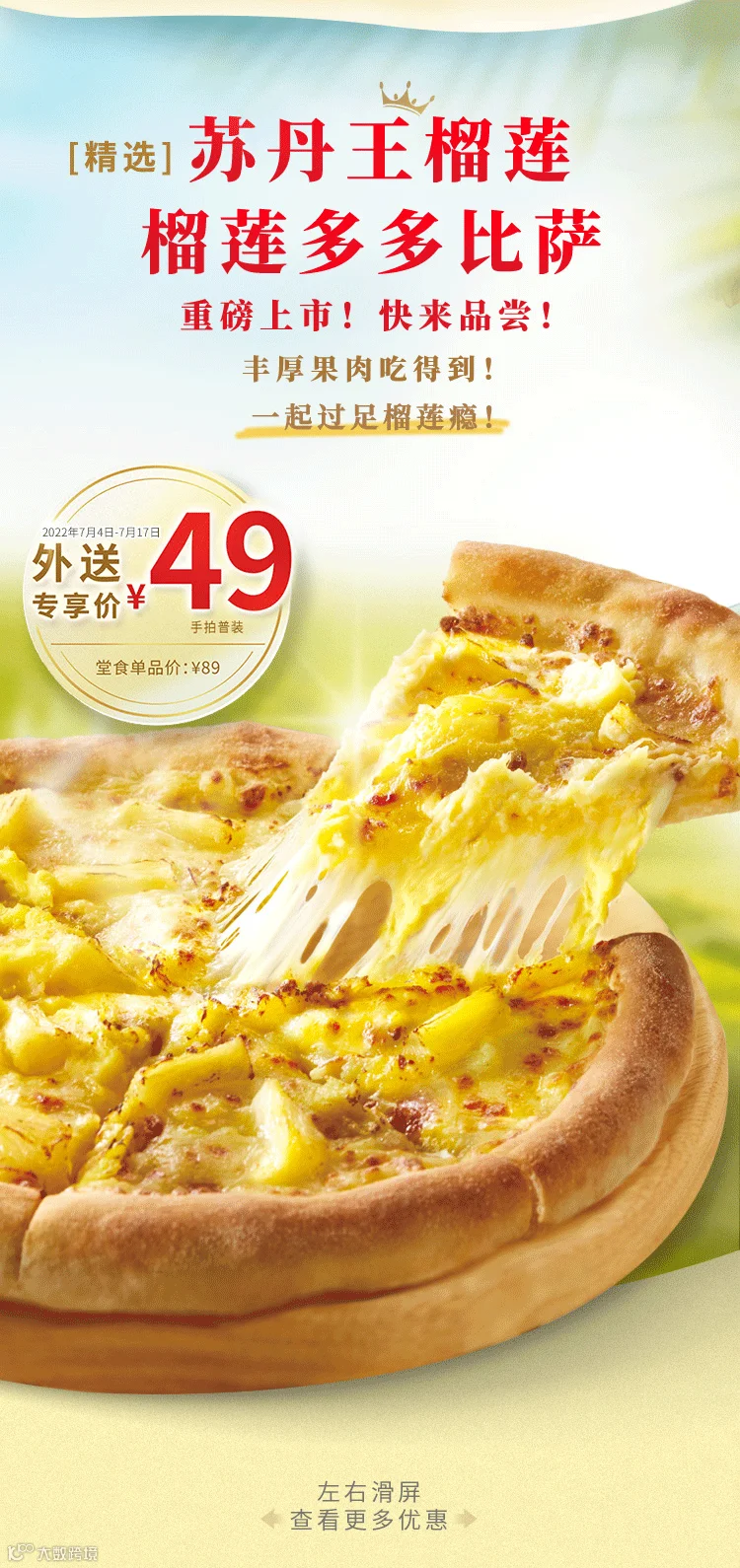 2022年7月4日到7月17日,通过必胜客宅急送官方网络订餐,可享榴莲多多比萨手拍普装尝鲜价49元,2022年7月17日起促销期结束,恢复单品价89元售卖。2022年7月4日至2022年7月10日,通过必胜客宅急送官方网络订餐,即可享指定比萨2件99元 (烤肠卷边普装或芝心卷边普装1个加手拍普装或铁盘普装1个)活动,内含:(1)以下烤肠卷边普装或芝心卷边普装比萨任选一份:和牛超级至尊比萨、超级至尊比萨、海鲜至尊比萨(鳕鱼版)、新奥尔良风情烤肉比萨、奶油菠菜菲力牛肉比萨、薯角培根比萨、经典夏威夷风情比萨、榴莲多多比萨;(2)以下手拍普装或铁盘普装比萨任选一份:榴莲菠菠块块果肉比萨、黄金六两松板肉比萨、意式肉酱比萨、新奥尔良风情烤肉比萨、必胜硬核肉多多比萨、奶油菠菜鸡肉比萨。额外加料部分消费金额不参与任何优惠活动。