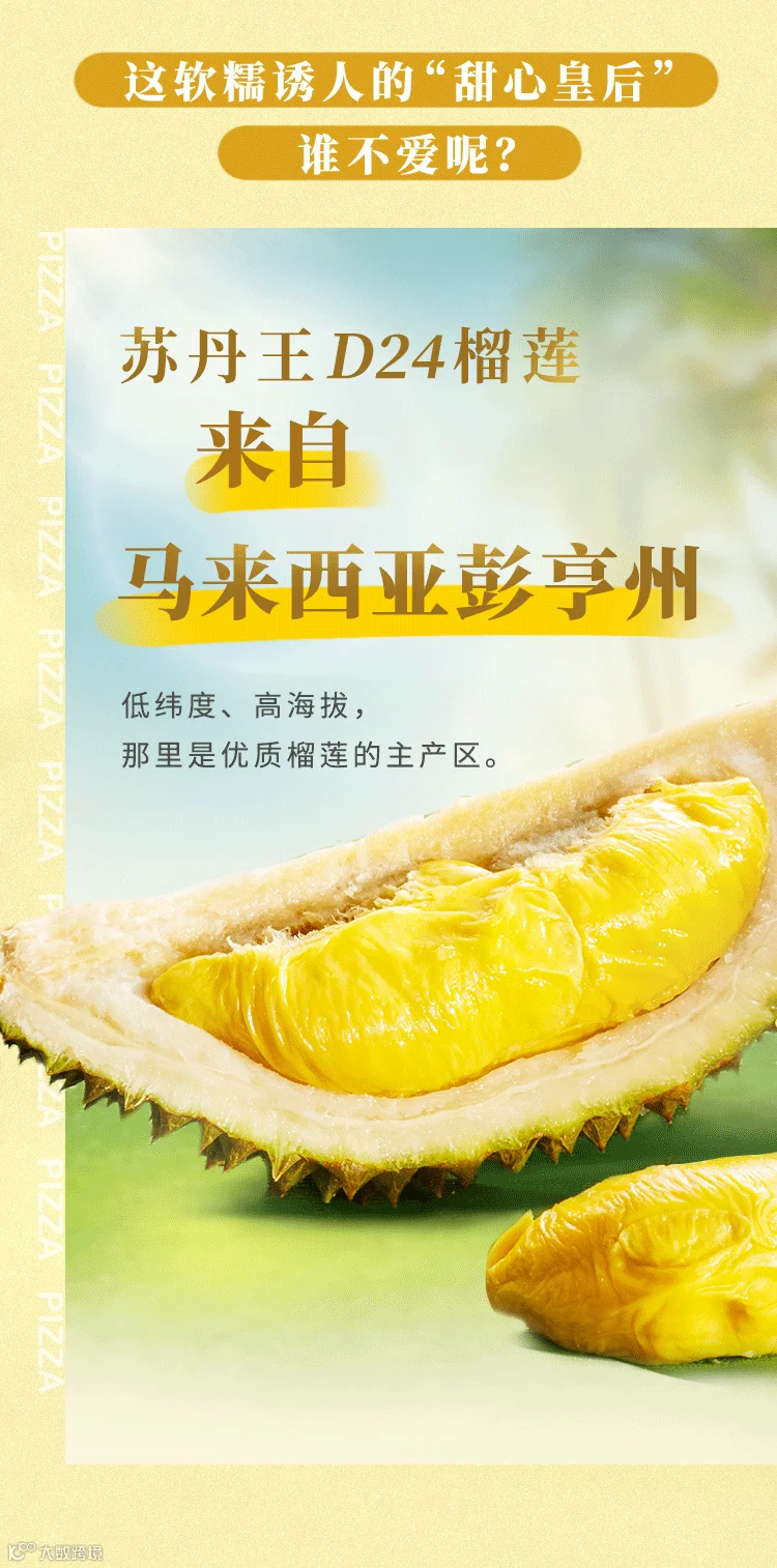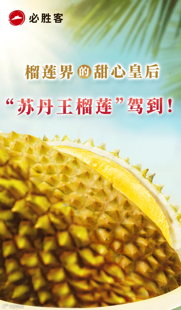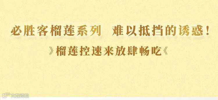 2022年6月13日至2022年12月31日,消费者可前往指定必胜客欢乐餐厅,通过堂食扫码点餐或自助点餐外带自取,可点购榴莲多多比萨手拍普装 89元,榴莲多多比萨芝心普装/烤肠卷边普装/ 酥松卷边普装/双芝卷边普装109元。