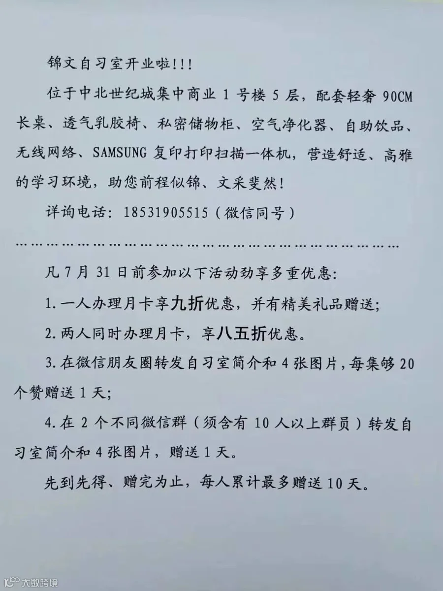 锦文自习室开业啦还在为考研、考博、公考、司考、会计、医师...寻找舒适静心的学习环境吗