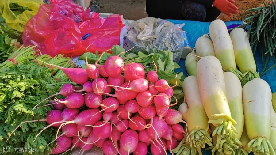 菜摊上,白的、黄的、红的、绿的~