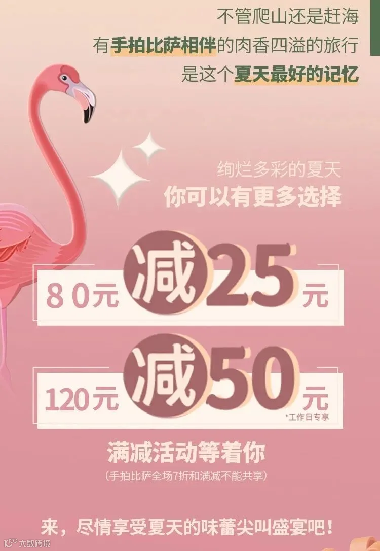 2021年6月28日至7月 28 日每周一二三,在必胜客宅急送官网订餐,可享尖叫一二三活动。活动内容:可以菜单单品价的7折点购任一款必胜匠心手工现拍饼底比萨。产品实际规格以克重为准。必胜匠心手工现拍饼底比萨每日全国限量供应72,000个,先到先得,售完即止。2021年6月15日至2021年7月31日周一~周五,凭券在必胜客宅急送官方网络订餐,以单品价选购渠道内菜单餐品且单笔实付金额满80元可减25元优惠,满120元,可减50元优惠。优惠活动不与其他优惠同享且菜单中套餐及“必胜优选类别”产品不参与此活动。为确保产品品质,必胜客宅急送有送餐范围限制,若您的送餐地址不在送餐范围内,我们将无法为您提供外送服务,敬请谅解。订餐时间10:00-22:00, 不设最低消费,外送服务每单收取9元外送费,谢绝小费。不同送餐区域的菜单和价格有所不同;不同城市、不同时段产品品项及价格有所不同,详情以输入送餐地址后显示的实际供应菜单为准。产品规格详见必胜客宅急送官网。被比较价格是指产品在必胜客宅急送官网上的菜单单品价,所称优惠或折扣金额均以此为计算依据。如您消费过程中遇到问题,请咨询必胜客在线客服,在线客服工作时间(周一到周日9:00-22:00)。