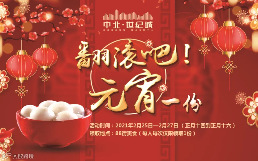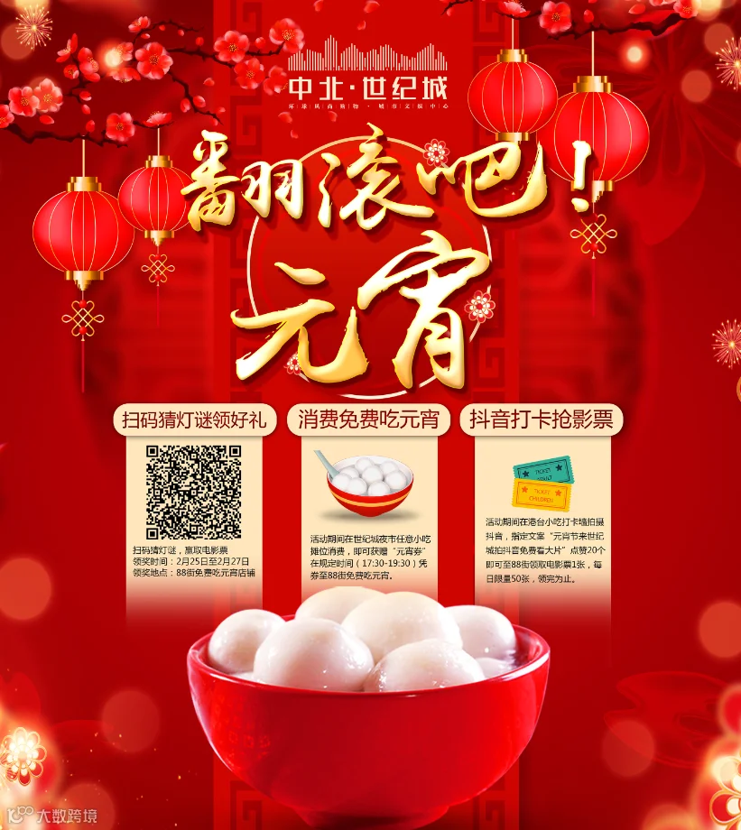 活动期间在世纪城夜市任意小吃摊位消费,即可获赠“元宵券”,在规定时间凭券至88街免费吃元宵。