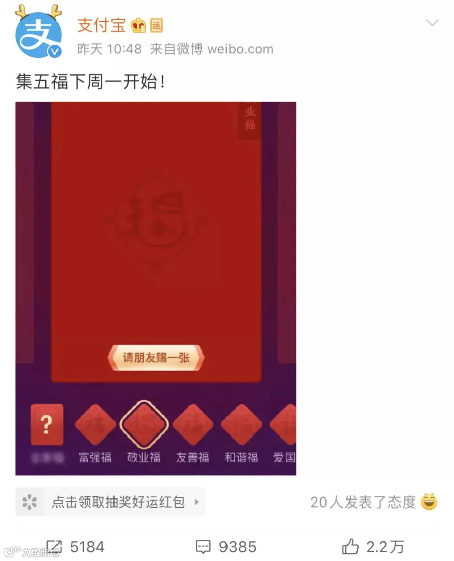 支付宝官方微博就放话称,集五福活动将于下周一也就是1月13日开始!活动将从1月13日(腊月十九)持续到到1月24日(除夕)。