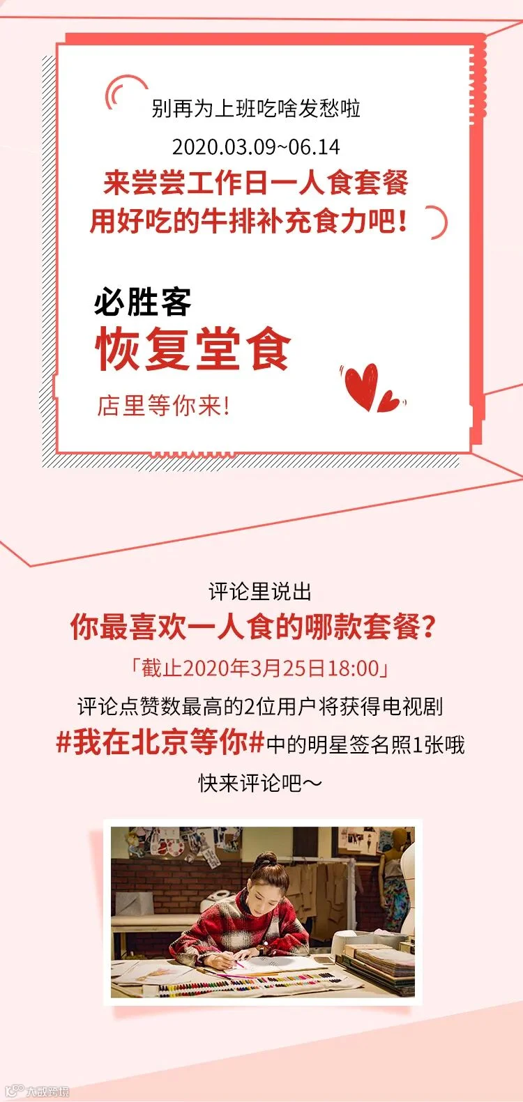2020年3月23日至3月25日18:00,在本微信下方评论留言最喜爱的一人食套餐名,即视为成功参与本活动。主办方将于2020年3月26日向评论获赞数最多的两名用户各送出#我在北京等你#明星签名照1张。
