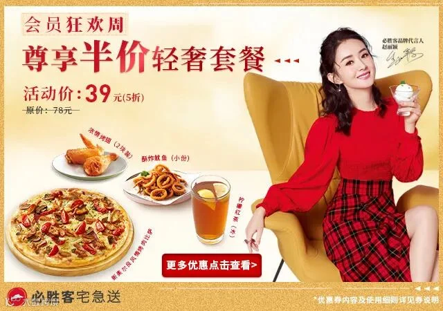 本活动自2020年3月23日至2020年3月27日。本活动仅限堂食,不适用于机场、火车站、旅游度假、游乐场、展览馆餐厅等部分必胜客特定餐厅,详洽餐厅;本活动优惠权益不与其他各类优惠共享。产品及包装以实物为准,具体产品及价格以餐厅菜单为准,图示内容仅供参考。