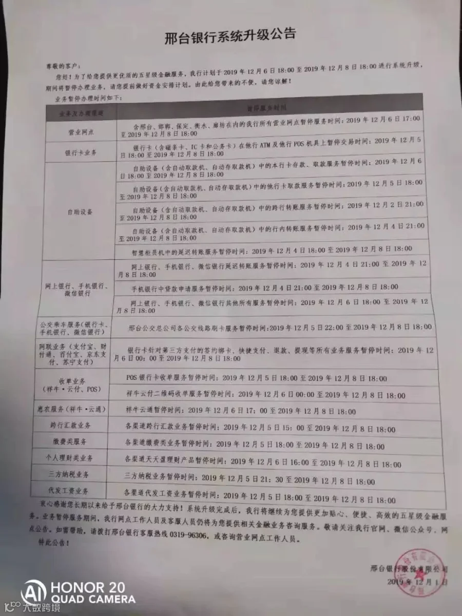 请您提前准备好其它支付方式乘车,由此给您出行带来的不便敬请谅解。待邢台银行系统升级完成后,我公司将及时恢复金牛卡刷卡乘车