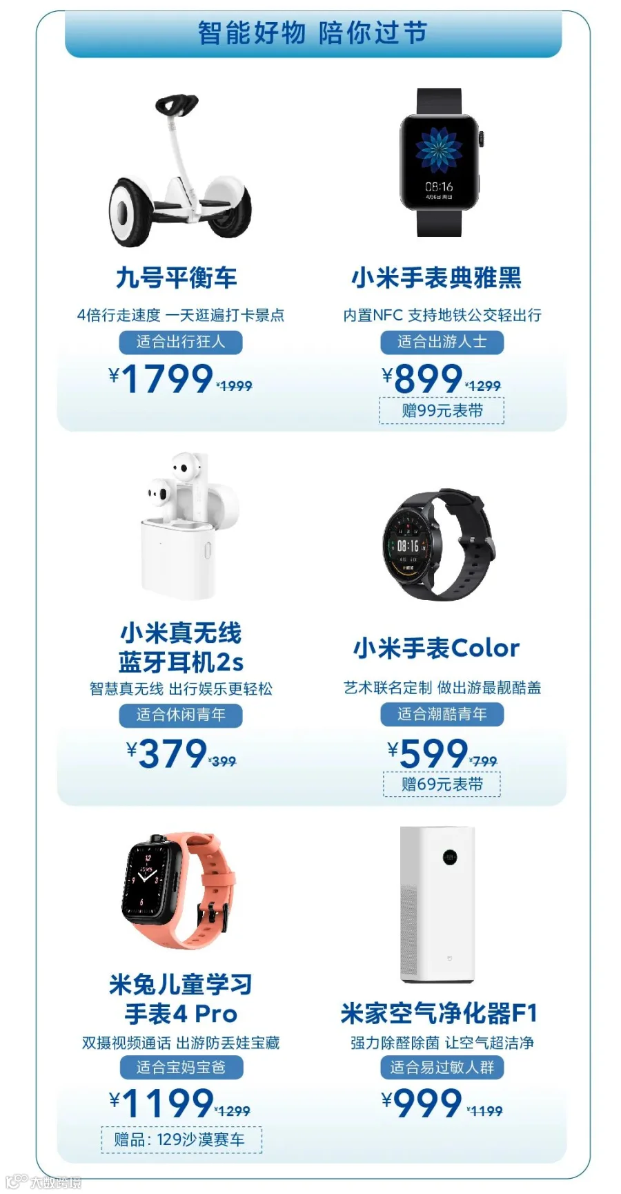 这个假期,多款智能好物齐放「价」,陪你过节。小米手表典雅黑直降300元,还送99元表带;米家空气净化器F1直降200元,现价仅需999元!