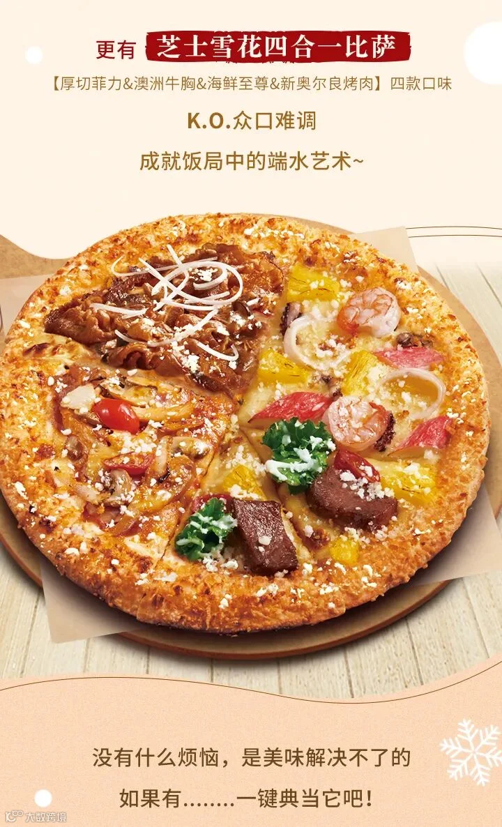 芝士雪花四合一比萨8折券:凭券到店可以单品价的8折点购指定比萨1份,共100份;