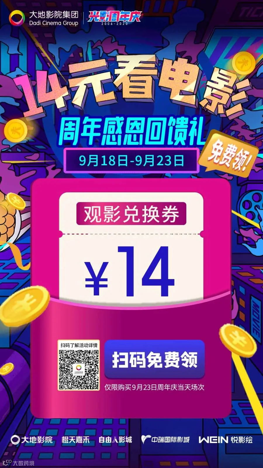即刻送上14元观影兑换券扫码免费领欢享周年礼遇,想看的电影马上约起来吧!