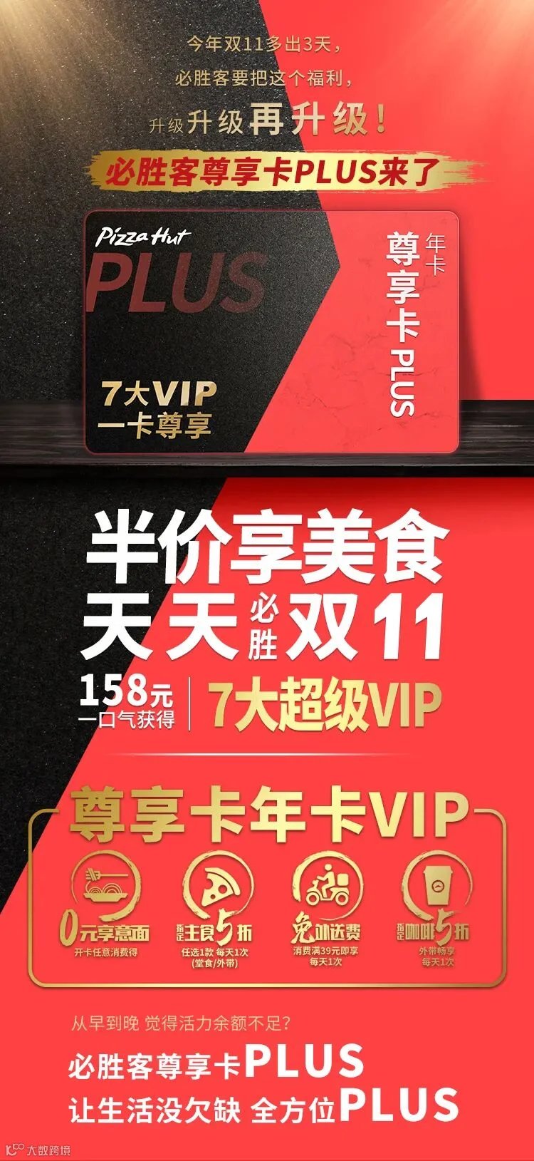 指凭尊享卡可依使用规则享全部指定主食/外带咖啡5折优惠。尊享卡plus(年卡)权益内容:本卡(“尊享卡plus”)有效期自购买之日起365天,含会员权益如下:【堂食+外带|年卡(365天)】开卡礼-任意消费享经典意式肉酱面1份。【堂食+外带|年卡(365天)】5折享精选主食(即:指定款面饭/牛排/比萨产品)每天1次。【外带|年卡(365天)】5折享指定精选咖啡 每天1次。【宅急送|年卡(365天)】官网点餐消费满39元免外送费每天1次。尊享卡plus权益可在必胜客APP【必胜客APP—首页—尊享会员卡-尊享卡-尊享卡plus】中查看,其他的合作联名权益可根据上方提示在对应APP中查看。