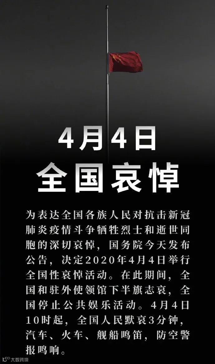 全国和驻外使领馆下半旗致哀,全国停止公共娱乐活动。4月4日10时起,全国人民默哀3分钟,汽车、火车、舰船鸣笛,防空警报鸣响。