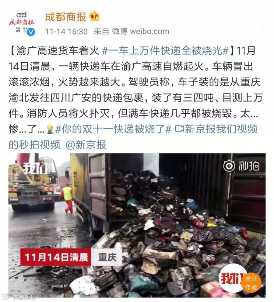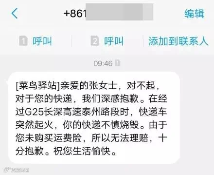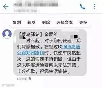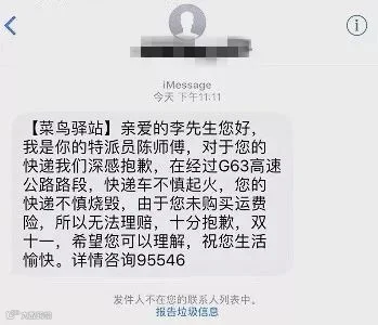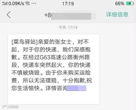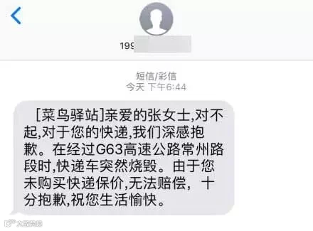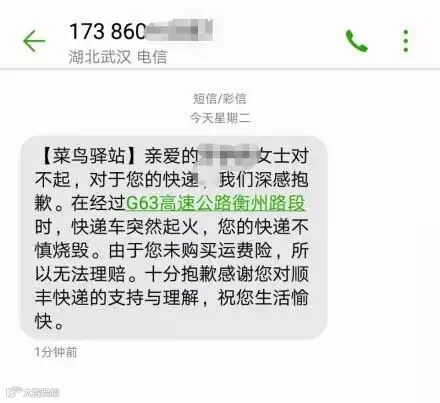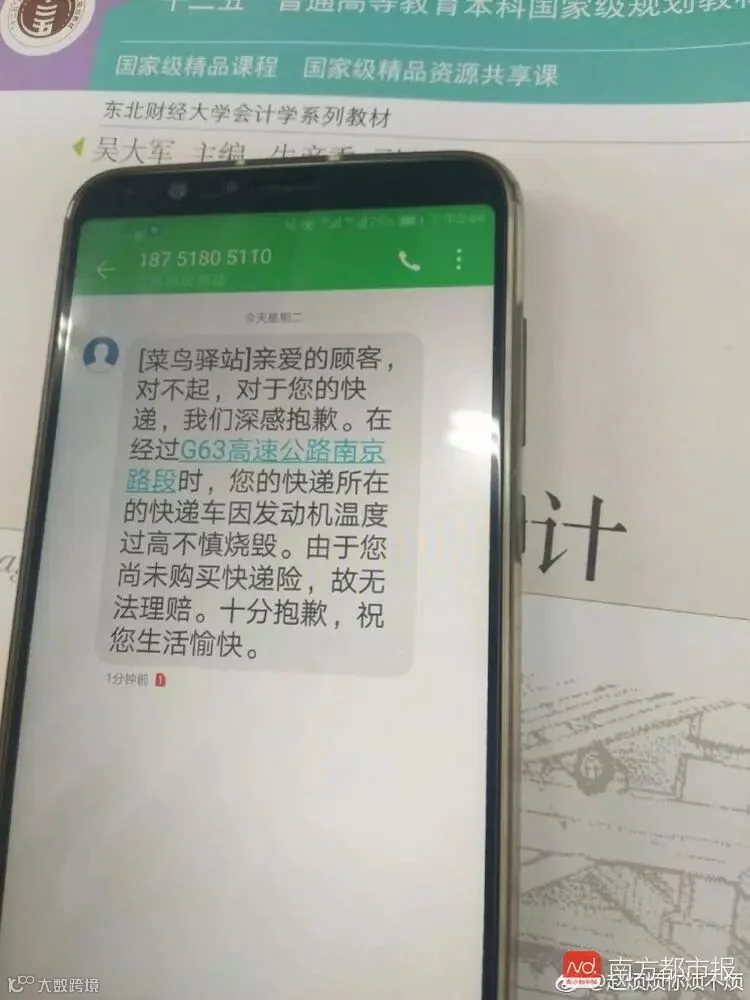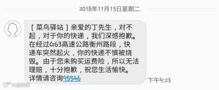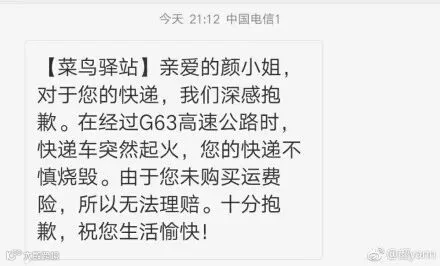 据南方都市报报道,11月13日下午,安徽网友@赵烦烦 发布微博称舍友收到一条短信,疑似来自菜鸟驿站,内容写着“在经过G63高速公路南京路段时,您的快递所在的快递车因发动机温度过高不慎烧毁,由于您尚未购买快递险,故无法理赔。”