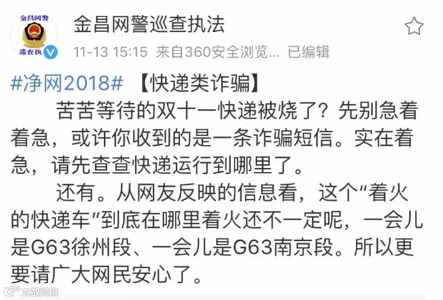 甘肃@金昌网警巡查执法 也提醒网友称,这类或是诈骗短信,“实在着急,请先查查快递运行到哪儿了。”