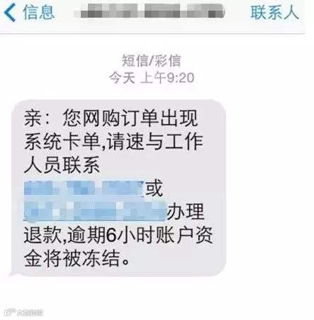 购物不久就收到一条来自私人号码的短信,声称“网购订单出现系统卡单,请速与工作人员联系。”短信文末还有可联系的私人号码以及第三方网站。