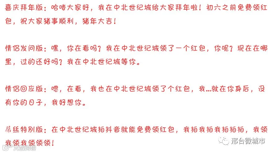③抖友福利:活动期间所有抖友可至中北世纪城“新年打卡墙”录制15秒拜年短视频并成功上传可参与抽红包活动;(要求拜年视频中必须含有特定的拜年台词,大家可以从以下四条中任选其一进行录制!)