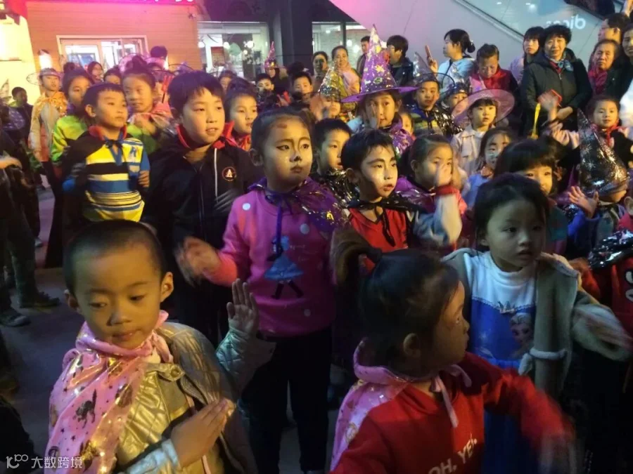 DIY服装秀的小朋友由老师分组带领上四楼小舞台处开始街舞快闪,小朋友欢乐舞台走秀,其他团体报名和社会报名的参与巡游的小朋友着装后等待学习快舞,集合排队一起巡游到夜市巡游,选择部分商家带领小朋友家庭一起捣蛋要糖果。