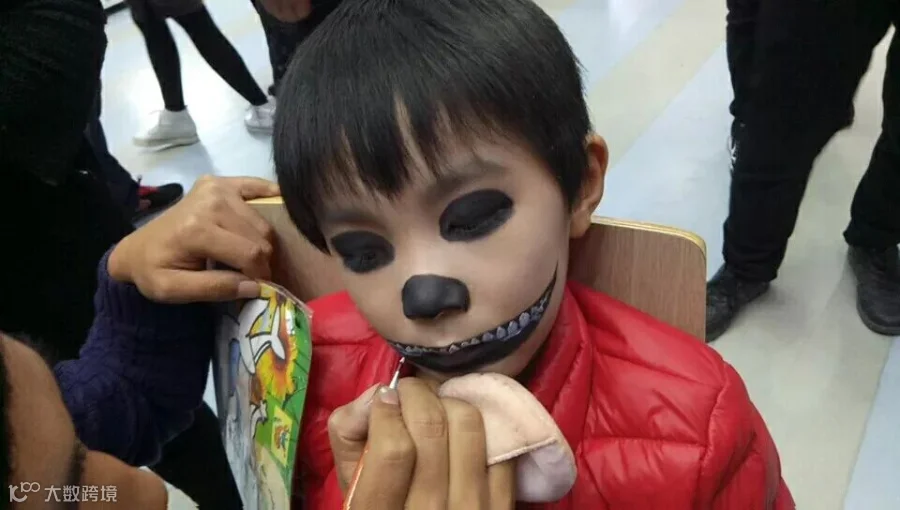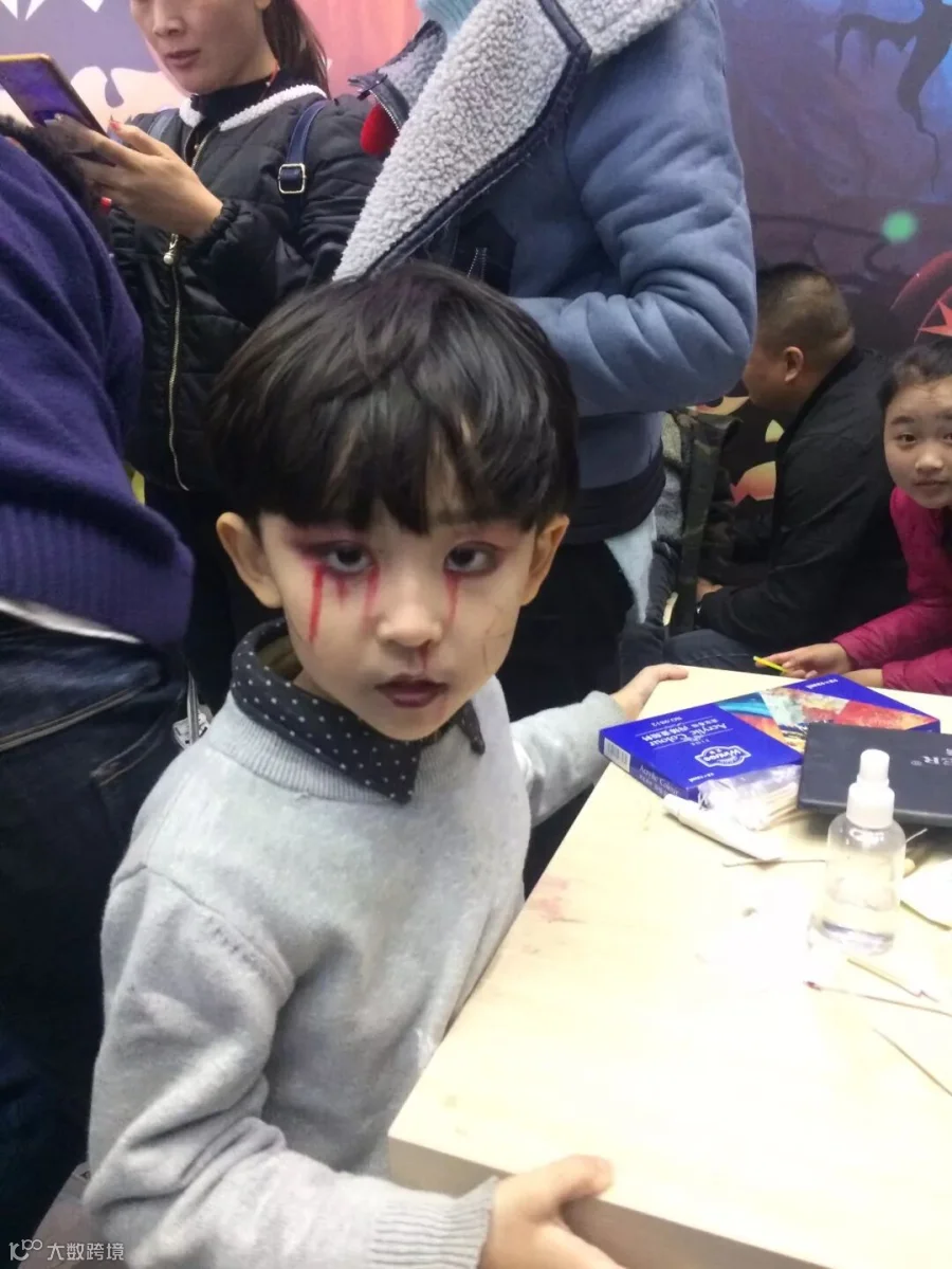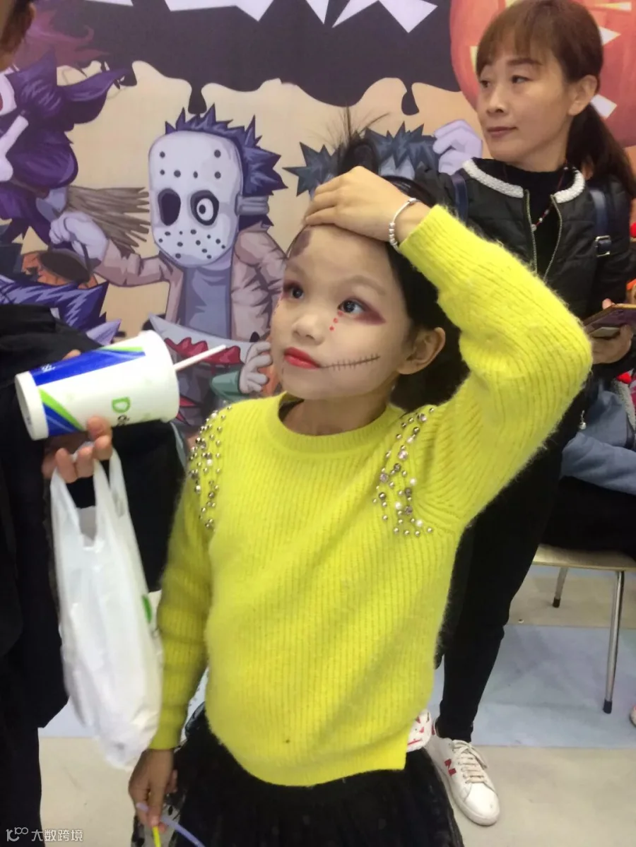 家长可以带孩子在门口处自行找化妆师化妆,也可以开始化妆DIY,也可以穿着魔鬼面具、服饰和魔法师帽等。