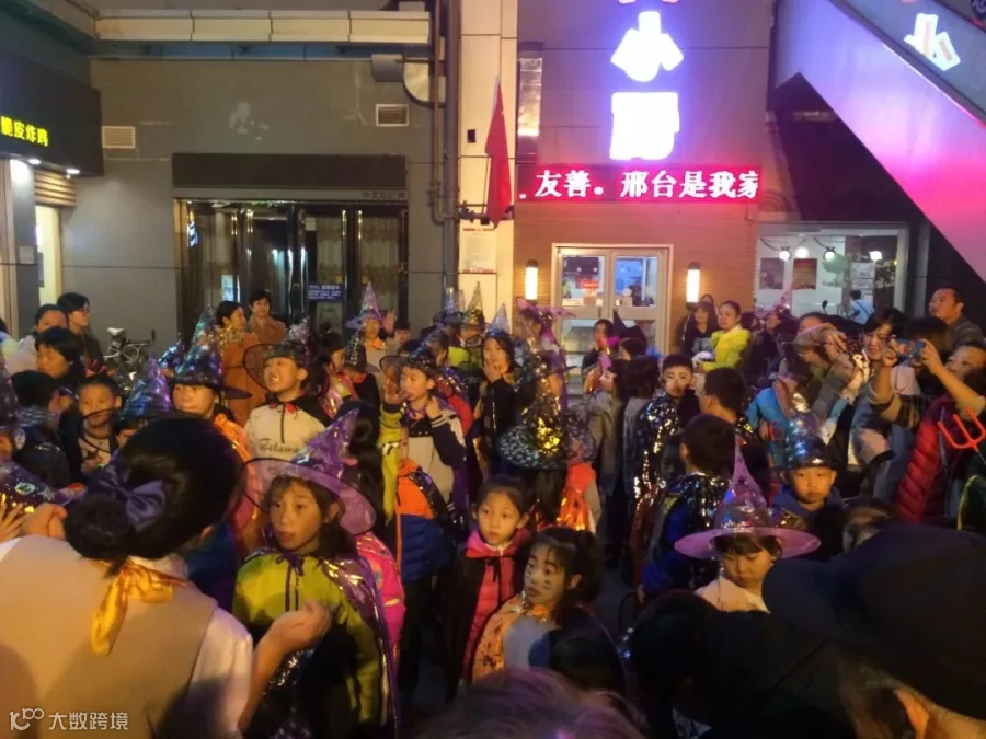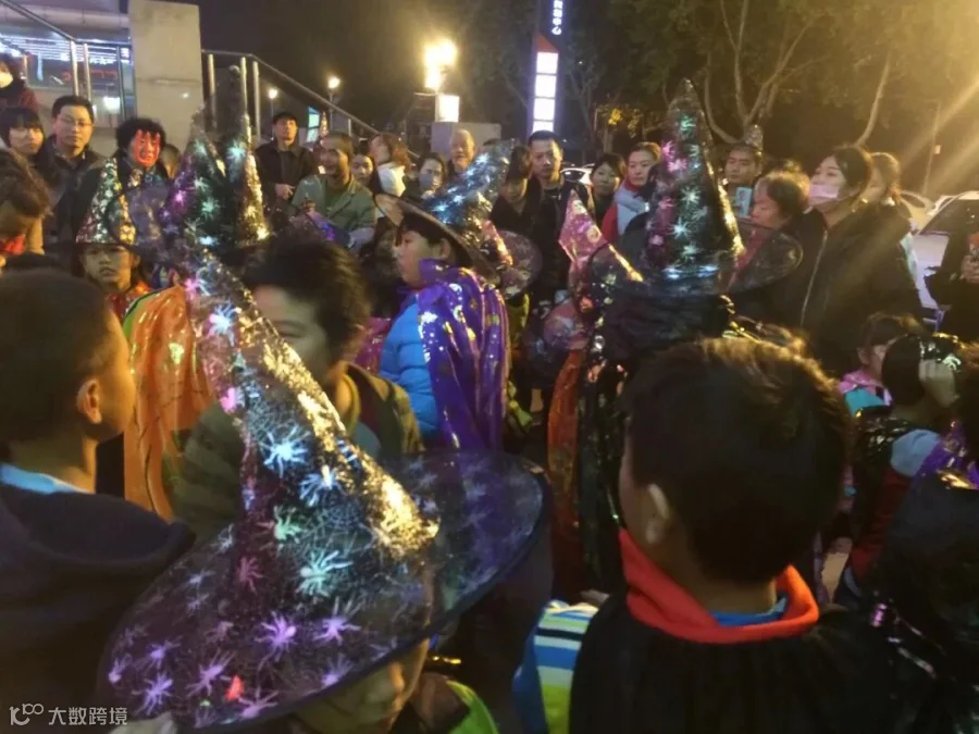 洋溢着神秘的色彩,弥漫着快乐的气息。万圣节当晚全城派对着魔,这里有来自小学、幼儿园的小学生们以及社会积极参与的培训机构小朋友们组成的巡游队伍一起开启免费捣蛋模式。