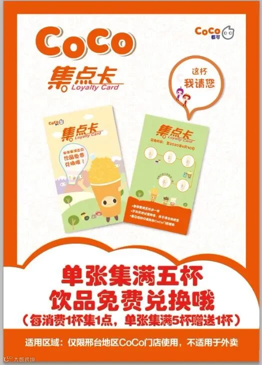 (即日起 集点卡单张卡片集满5个点可兑换门店任意饮品一杯)
