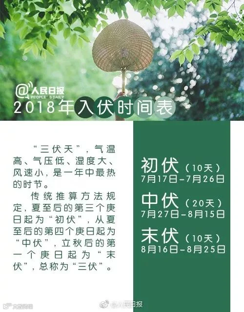 把最热的暑天称为“伏天”,是起源于春秋时期的秦国,《史记·秦纪六》中云:“秦德公二年(公元前676年)初伏。”唐人张守节曰:“六月三伏之节,起秦德公为之,故云初伏,伏者,隐伏避盛暑也。”今年的7月17日,是头伏的第一天,按中国的日历法来说,是真正暑天的开始。