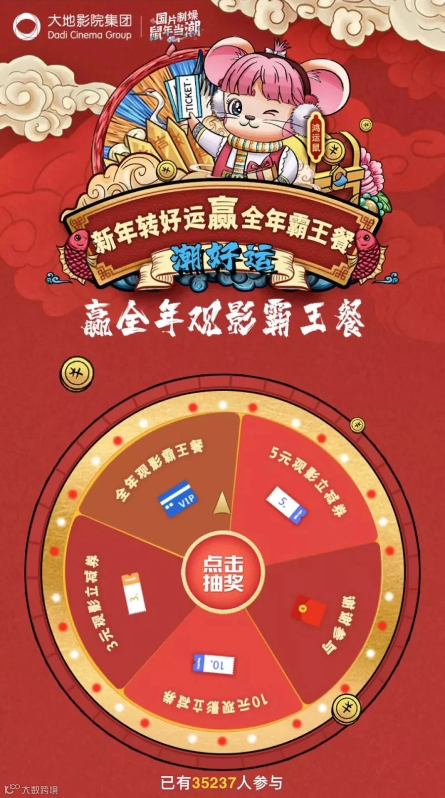 大地影院春节大转盘活动,每天放出2千份奖券,试试手气哈!会员每天都可以有两次机