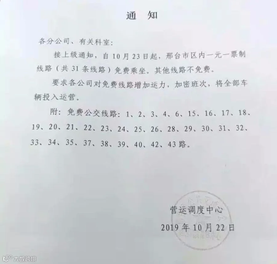 为进一步倡导绿色出行,减少主城区车辆的使用,削减机动车尾气排放,改善空气质量。经研究,我市决定自2019年10月23日至2019年11月23日,市主城区公交车辆实行免费乘坐,通向周边县(市)公交线路不在免费范围,其他常态化限行措施不变!