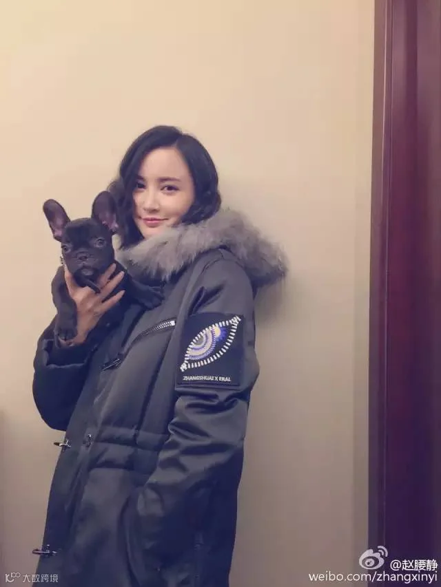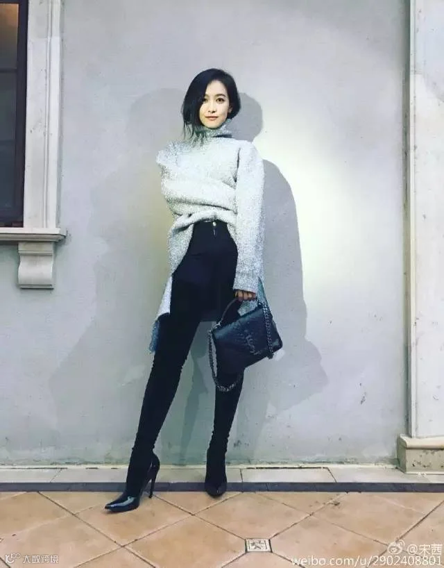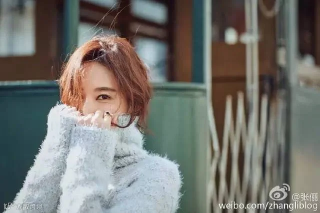 张俪把头发随意地放在高领毛衣里,