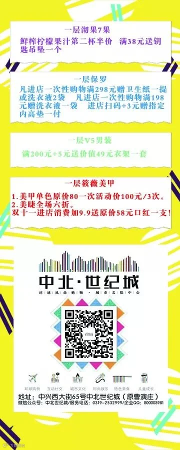 传播邢台流行时尚,会员相关网络活动互动,中北集团旗下的中北商贸所属商业:中北商贸、中北商城、新世纪商城、世纪城购物中心、欢乐购百货等相关品牌和商品促销宣传及公益服务。