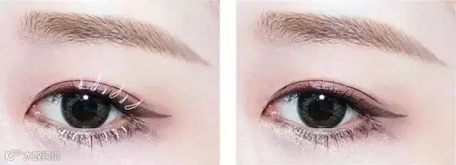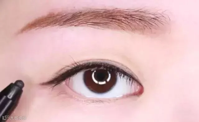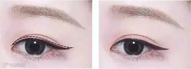 Step2:画一条黑色上眼线,从内眼角往外眼角逐渐加粗,并将眼线的尾部拉长,画出一个微微上扬的小三角。